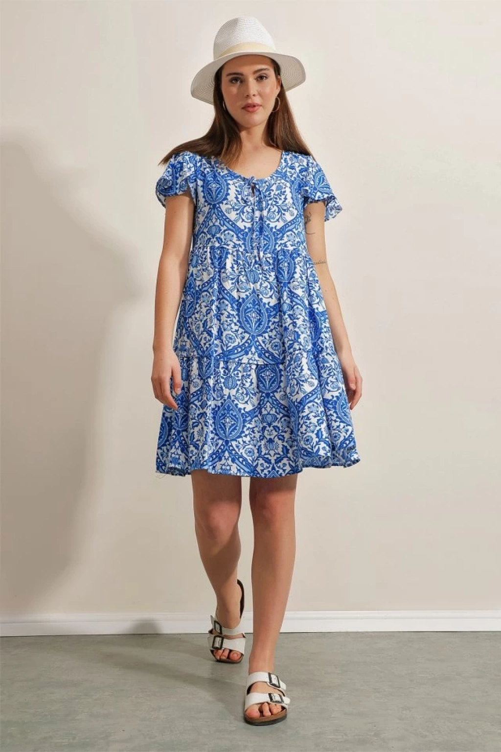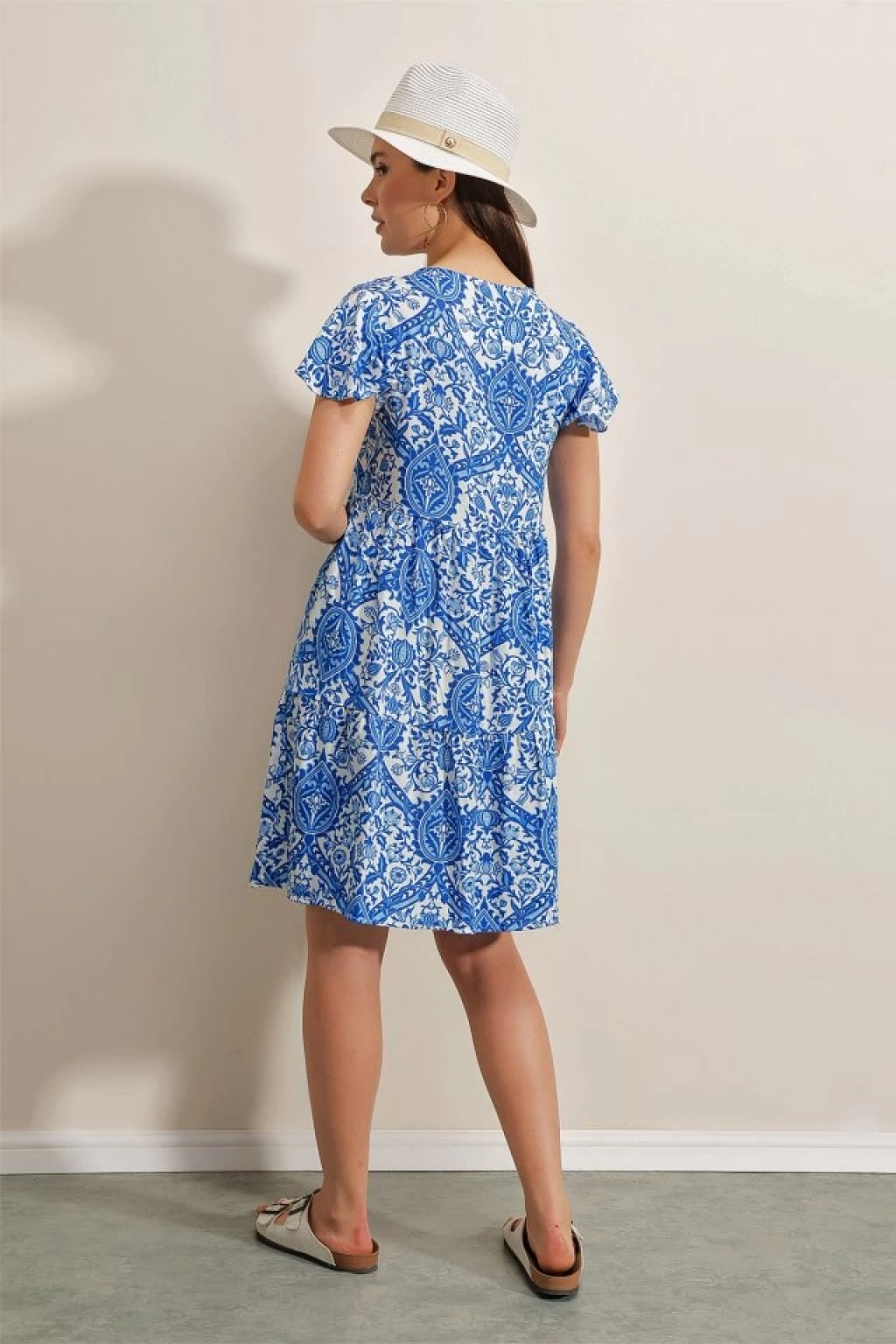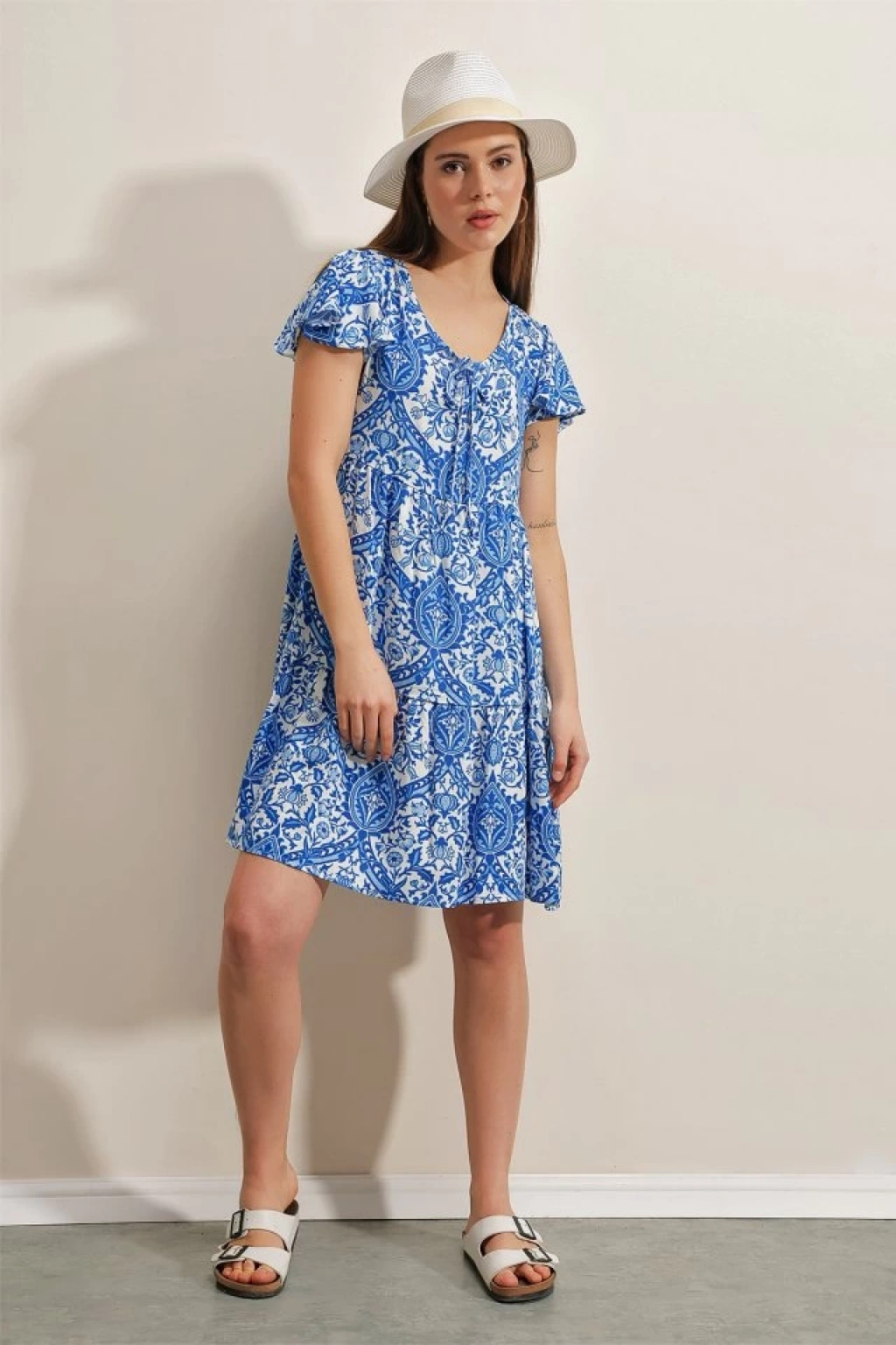 2352 V Yaka Kısa Elbise - Mavi