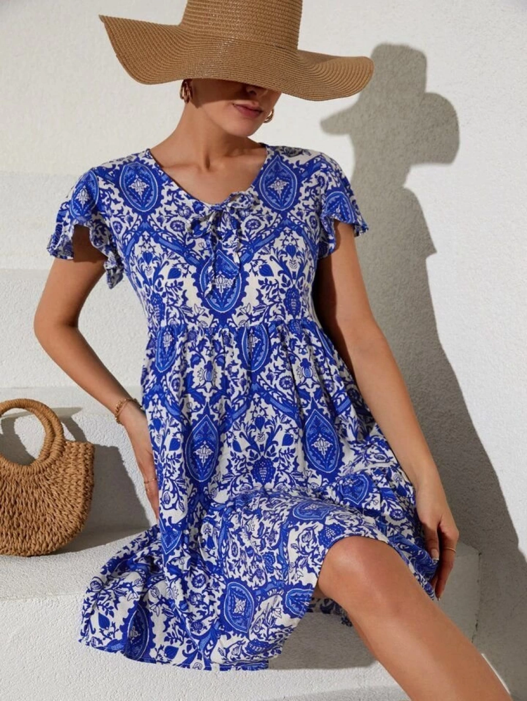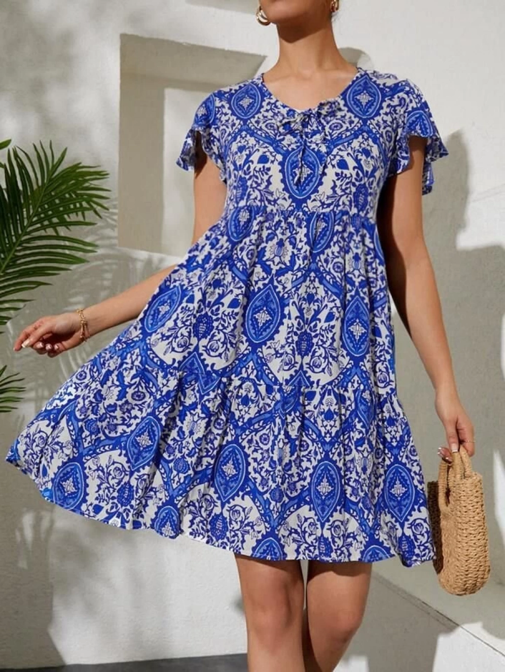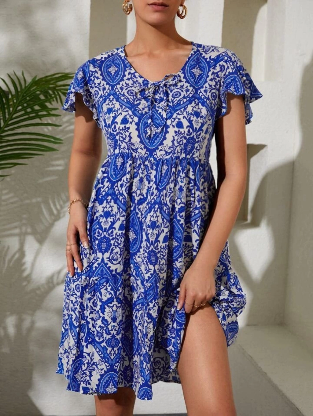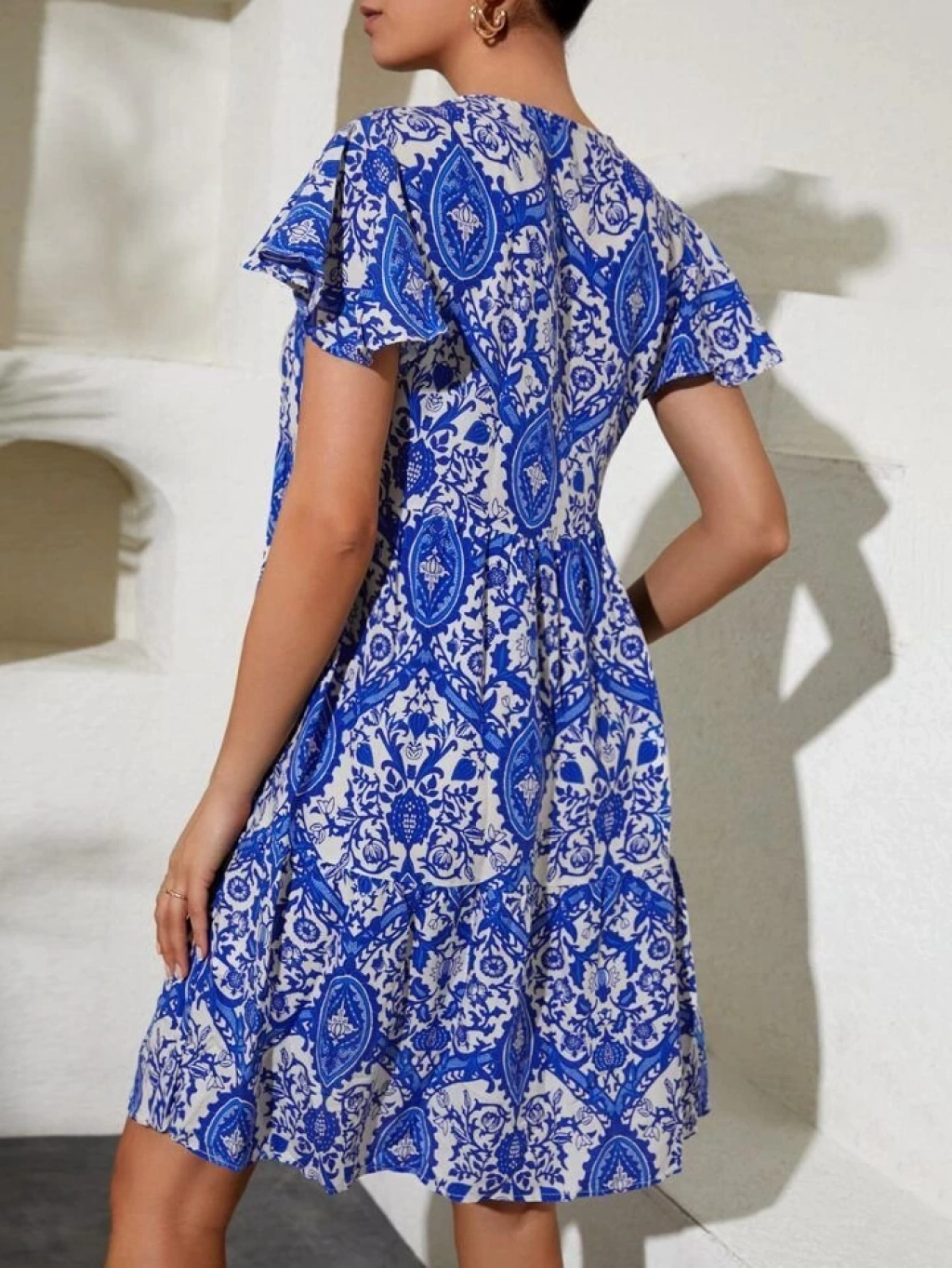 2352 V Yaka Kısa Elbise - Mavi