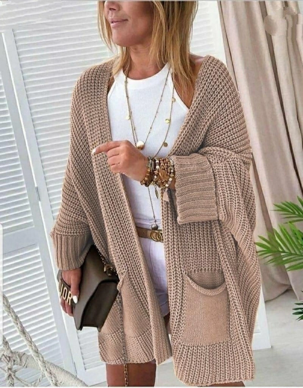 4Oversize Kalıp Cepli Salaş Triko Hırka BEJ