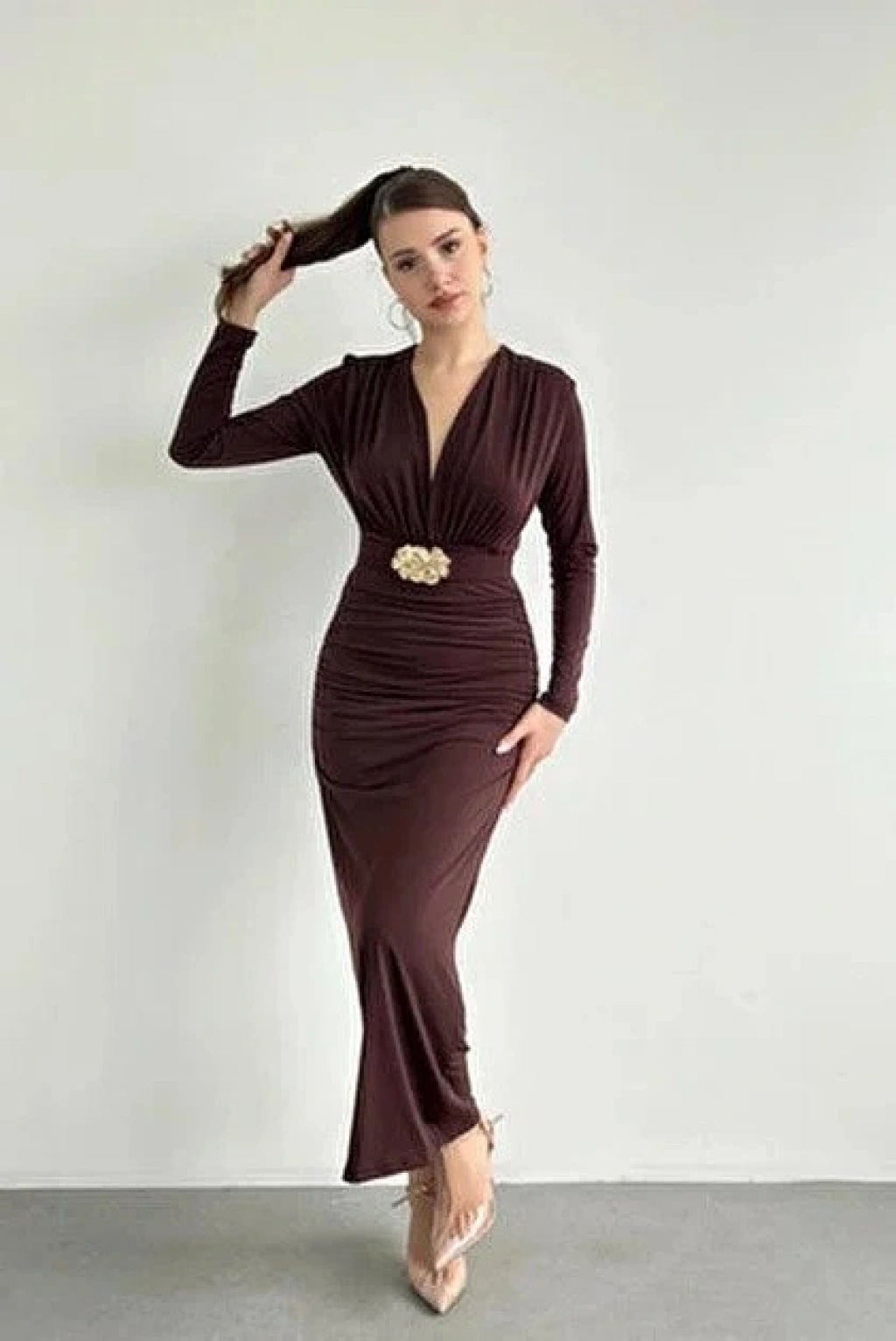 Aksesuarlı Kemerli Drapeli Uzun Elbise