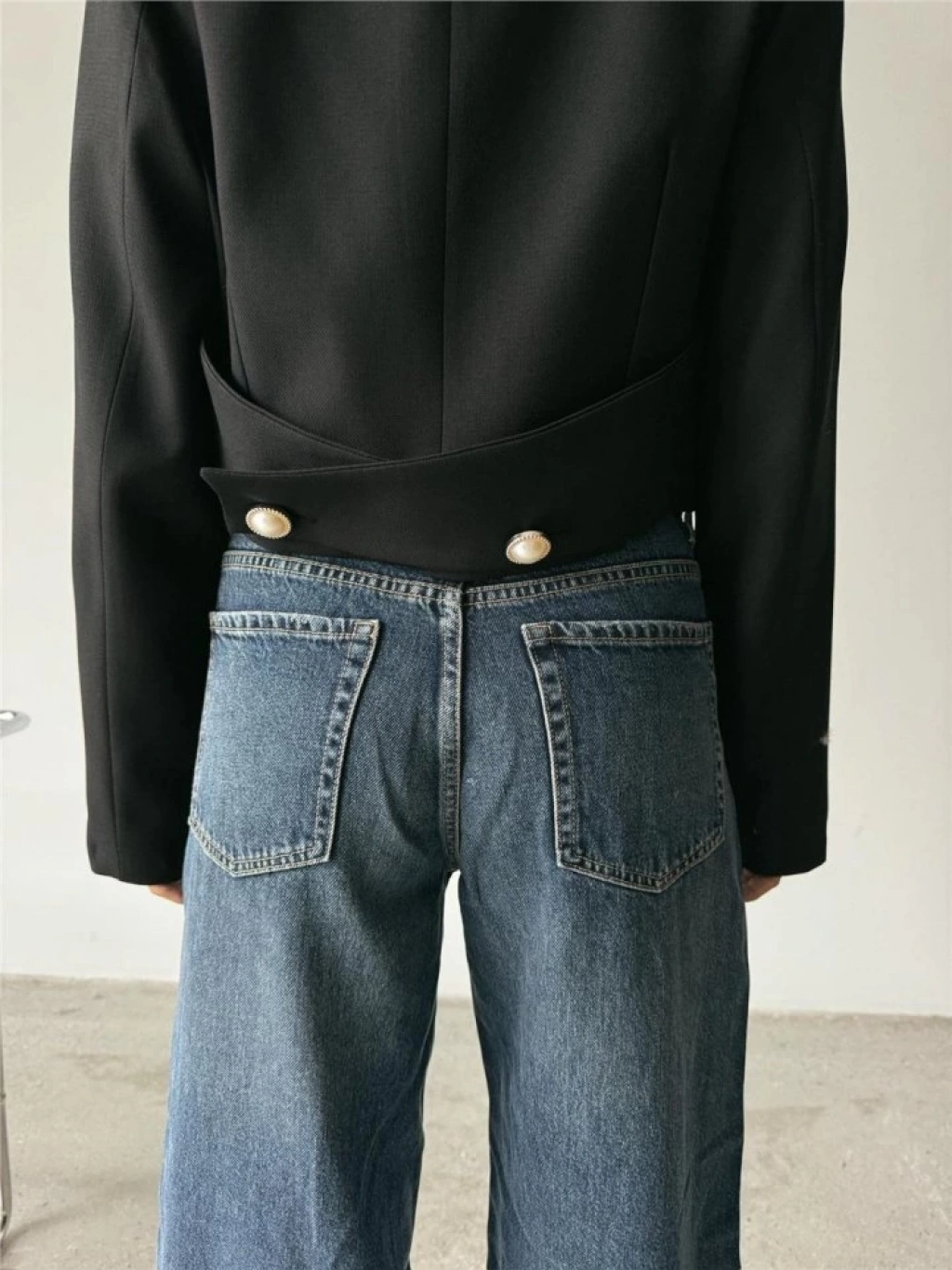 ARKASI İNCİ DÜĞME DETAYLI CROP CEKET - Siyah