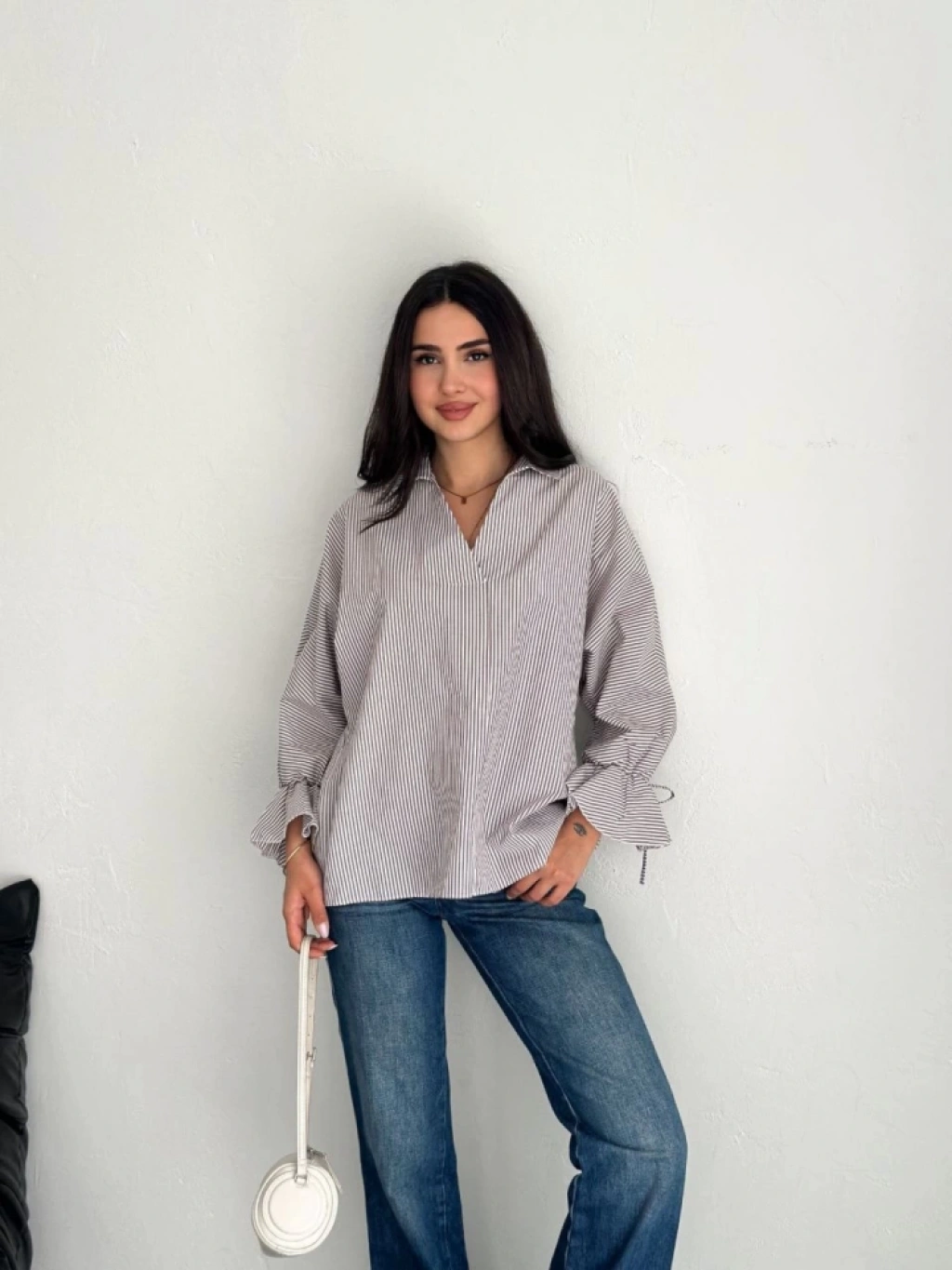 Arkası Asimetrik Yırtmaç Kesim Detaylı Cizgili Bluz Gömlek - Gri
