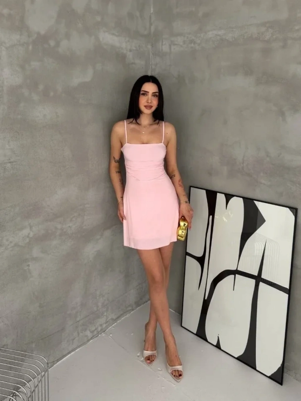Askılı Şifon Mini Elbise Drapeli Bel Vücuda Oturan Yazlık Şık - Pembe