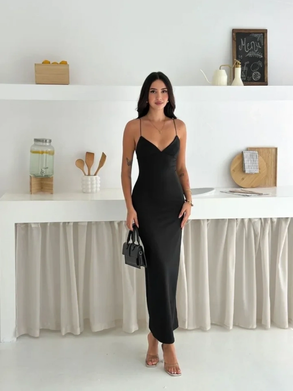 Askılı Uzun Elbise V Yaka Şık Gece Elbisesi Vücuda Oturan - Siyah