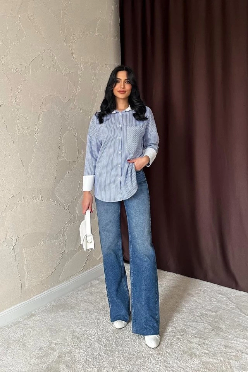 Mavi Çizgili Poplin Uzun Kol Gömlek