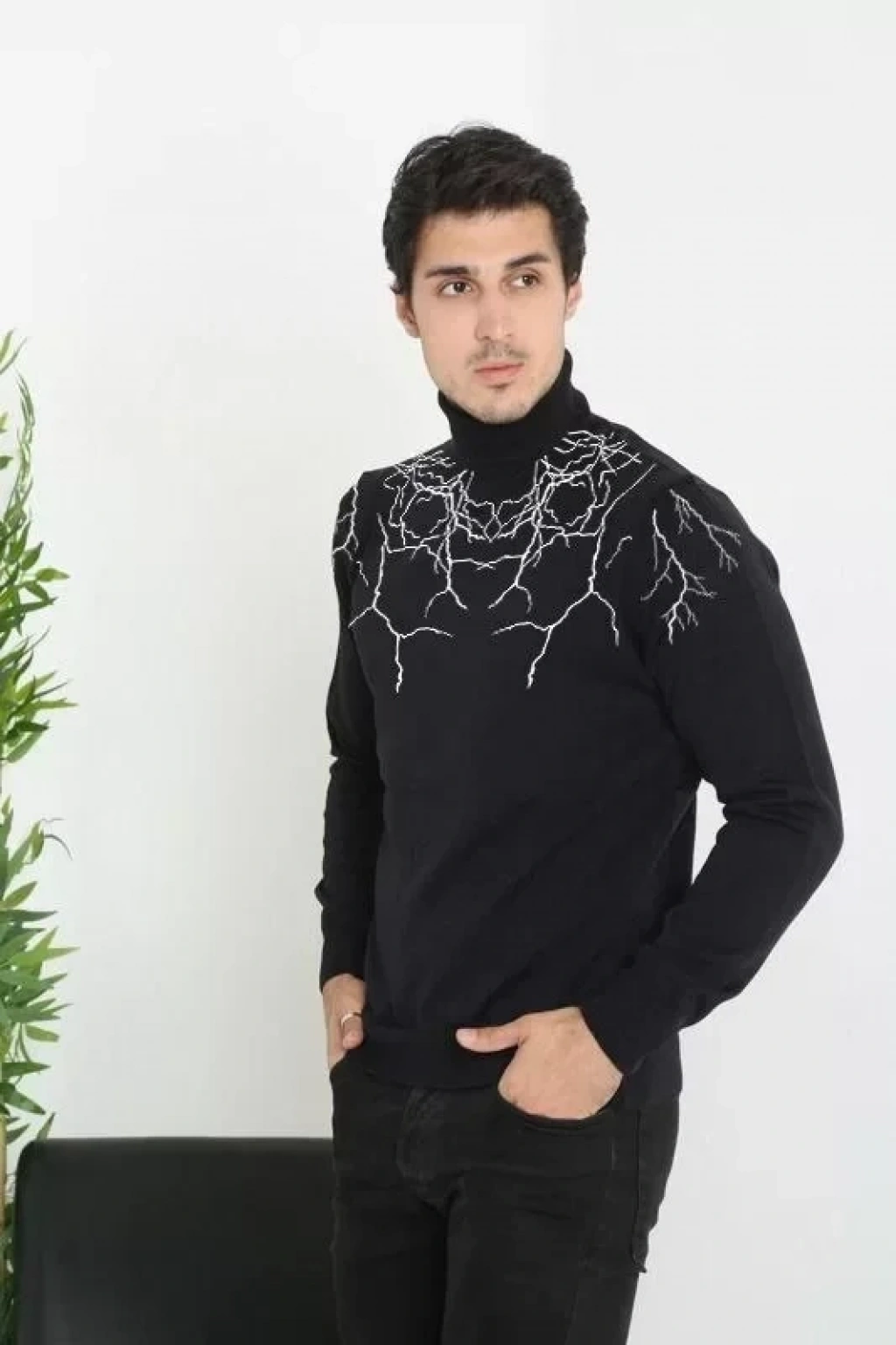 Baskılı Tam Boğaazlı Uzun Kol Dokuma Triko Siyah