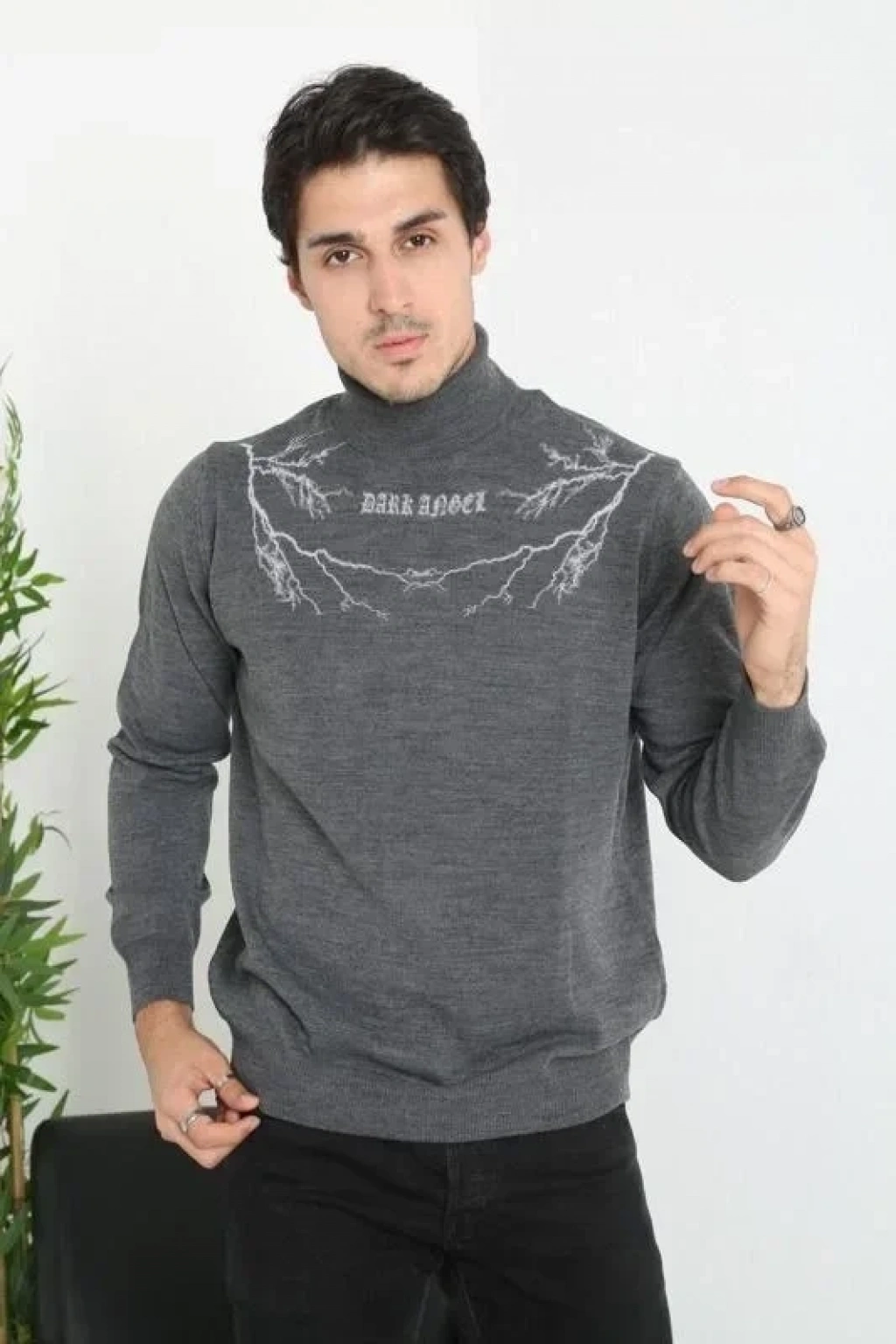 Baskılı Tam Boğazlı Uzun Kol Dokuma Triko Antrasit