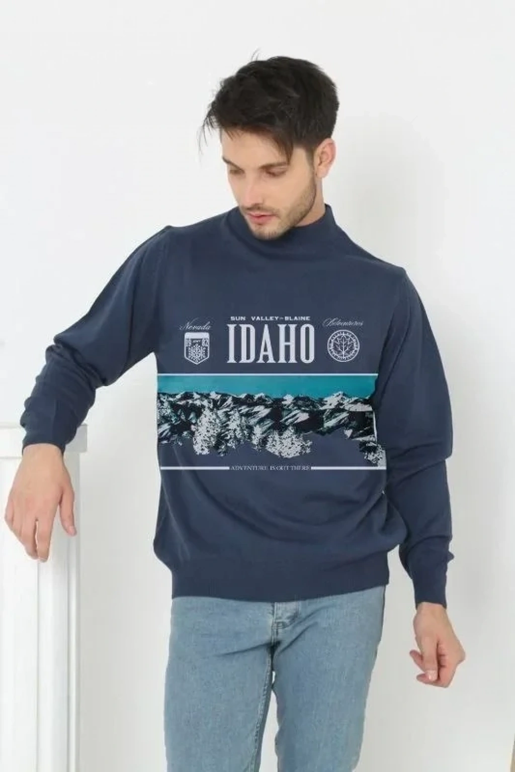 Baskılı Yarım Boğazlı Uzun Kol Dokuma Triko Indigo
