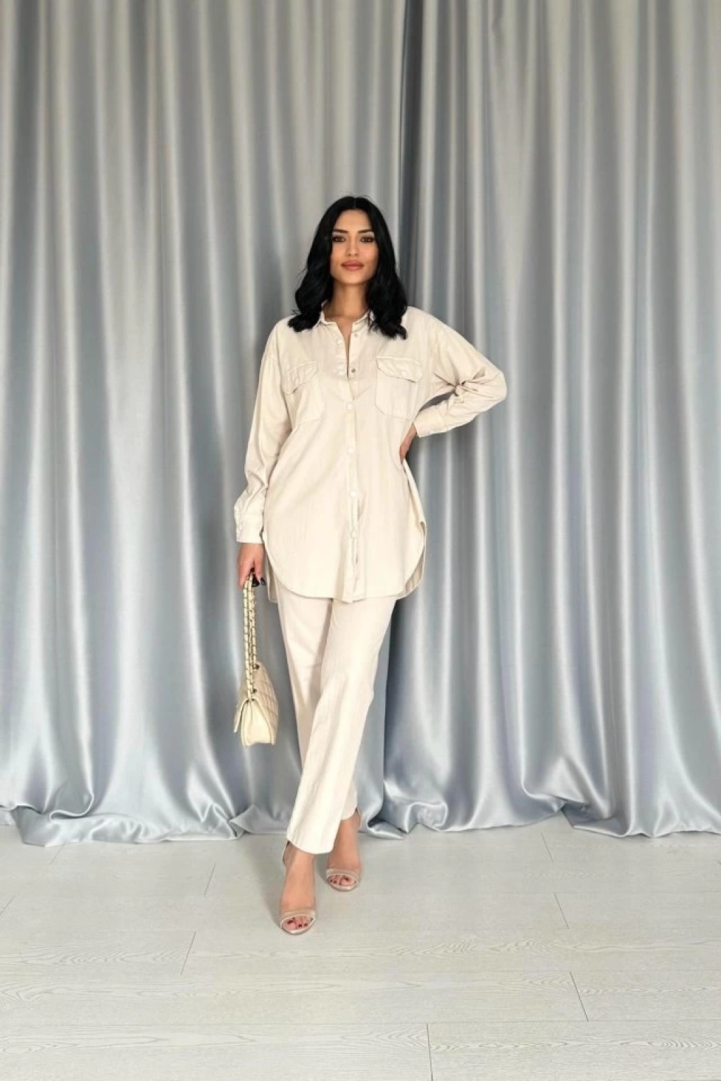 Bej Gömlek Ve Çıtçıtlı Pantolon Takım