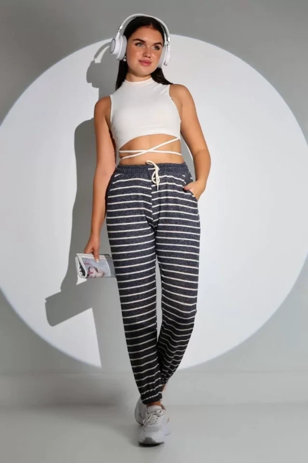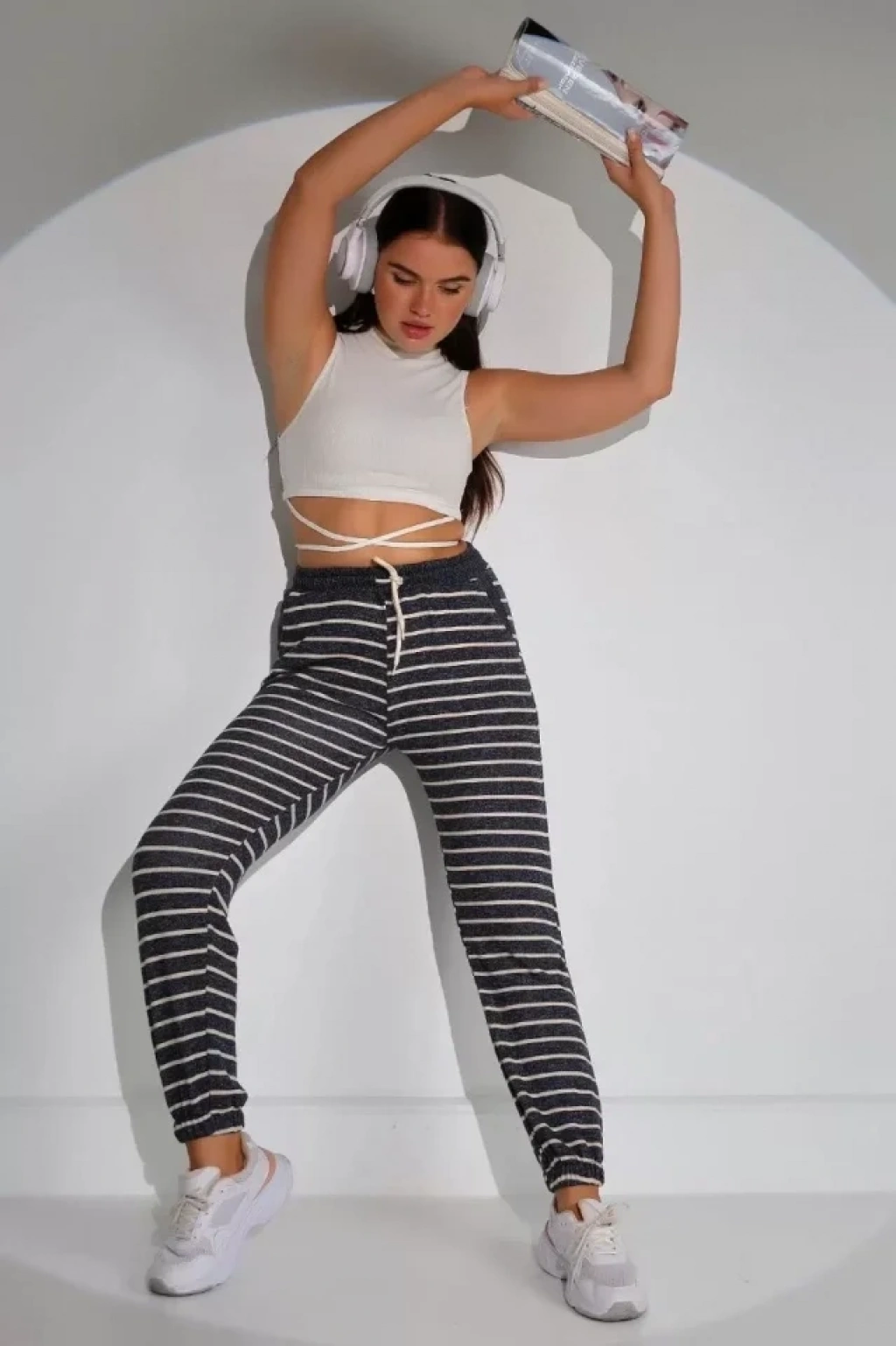Beli Lastikli Çizgili Eşofman Alt - Siyah