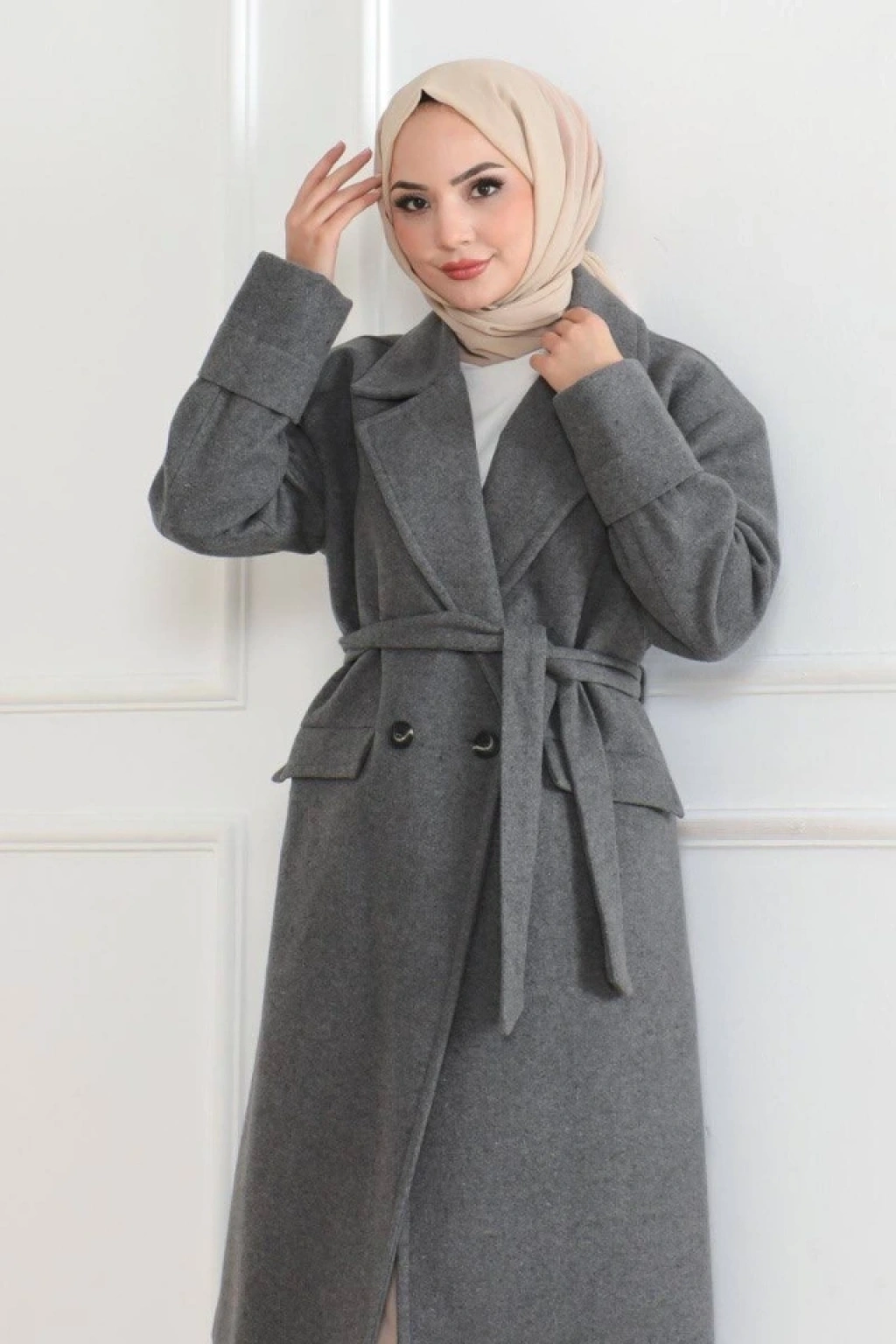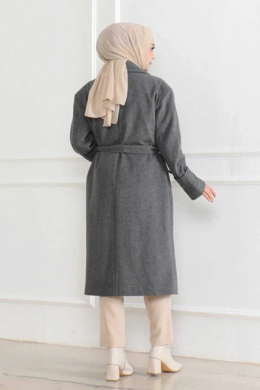Beli Kuşaklı Yünlü Dokuma Kaşmir Kaban - Gri