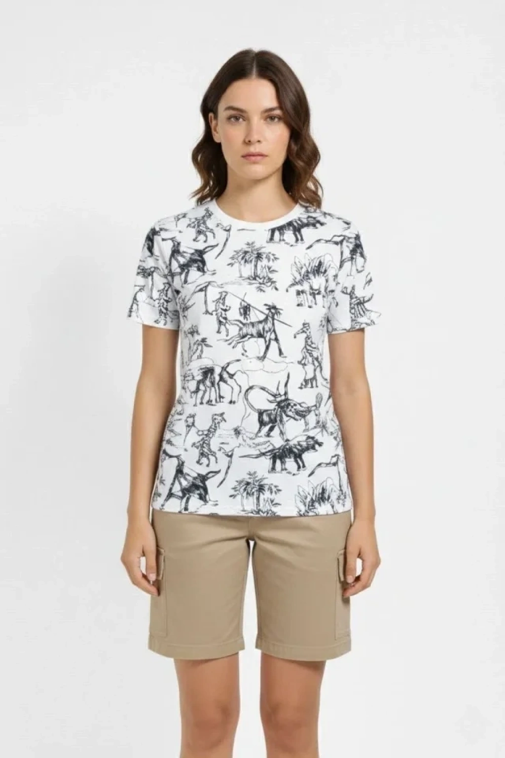 Beyaz Dinozor Desenli Tişört – Regular Kalıp, Bisiklet Yaka, Dijital Baskılı Pamuklu Thirt Beyaz