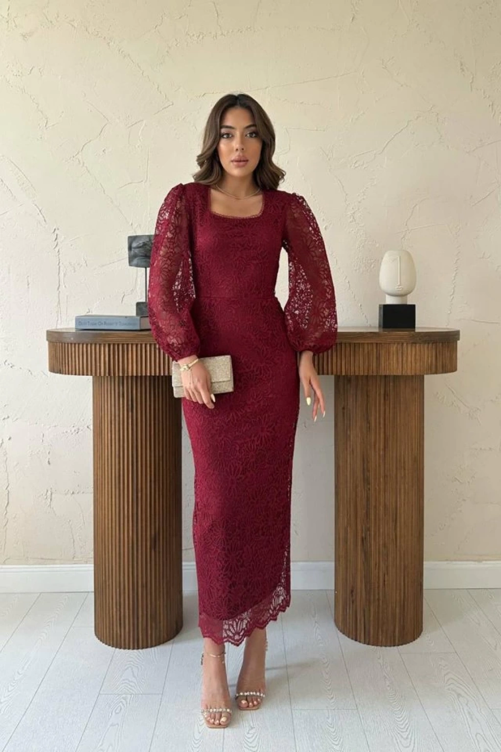 Bordo Güpür Detaylı Dantel Elbise