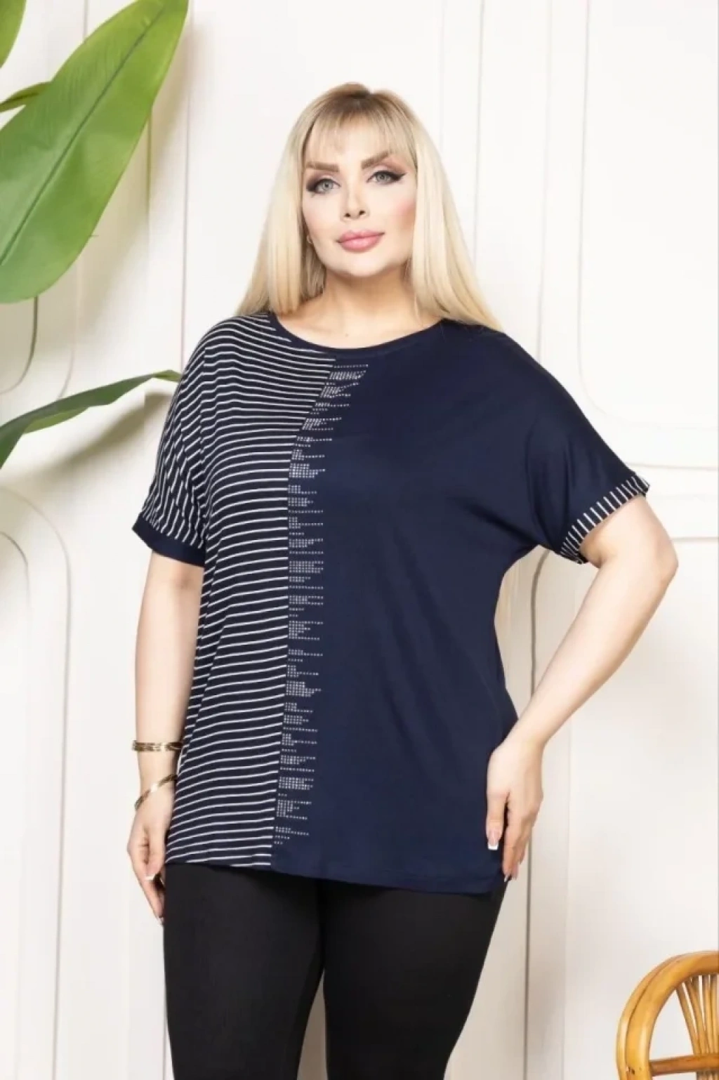 Büyük Beden Taş Detaylı Çizgili Viskon Tişört Bisiklet Yaka Rahat Kesim - Lacivert
