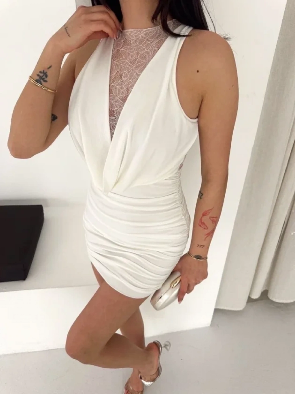 Dantel Detaylı Derin Dekolte Drapeli Mini Elbise Şık Kolsuz - Beyaz