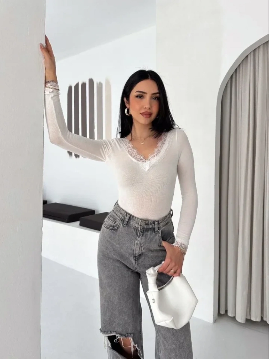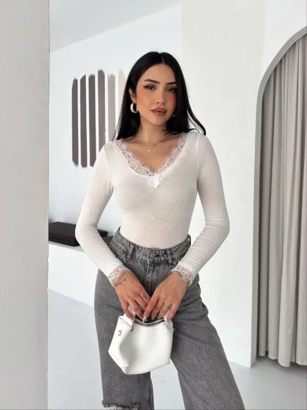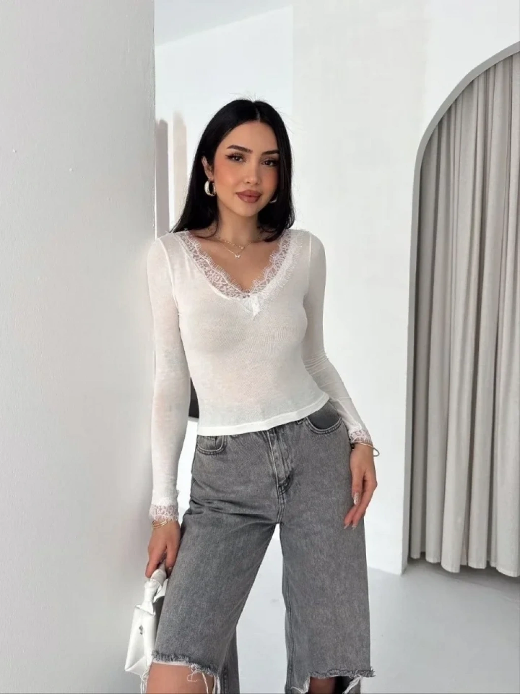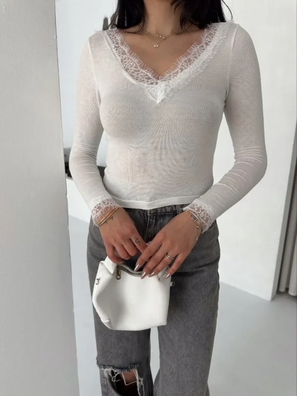 Dantel Detaylı V Yaka Arkası V Yaka Kaşmir Dokulu Uzun Kollu Bluz Beyaz