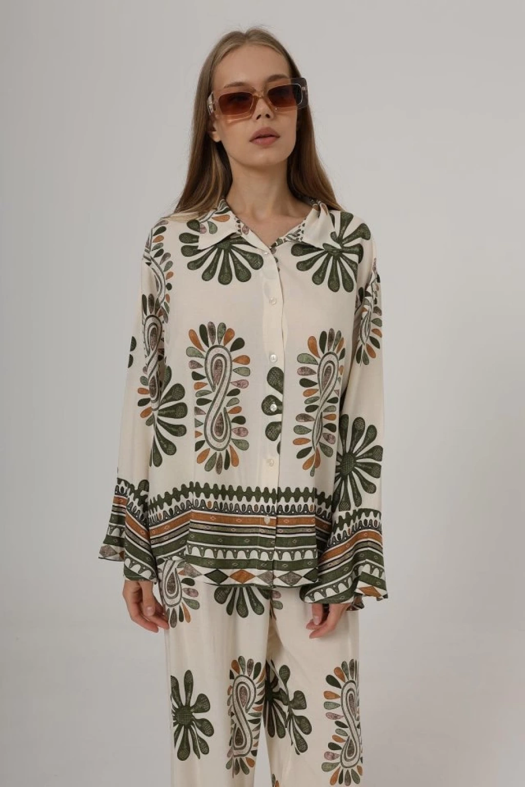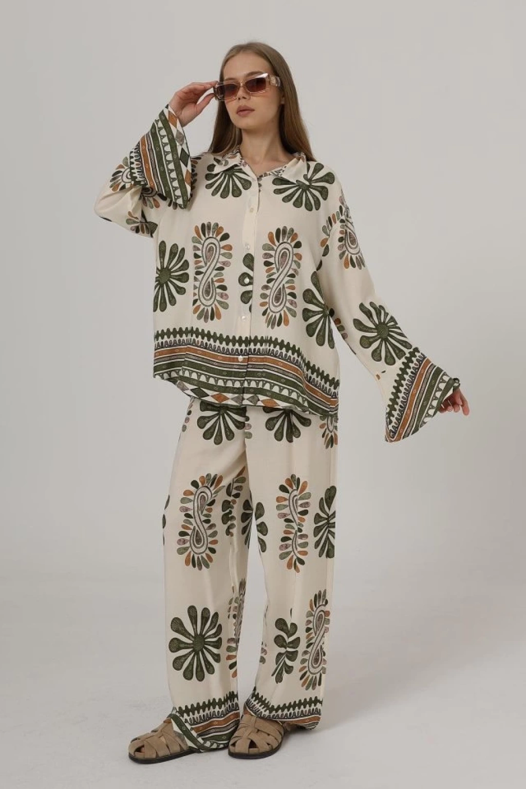 Desenli Kolları Volanlı Pantolon Takım - Haki