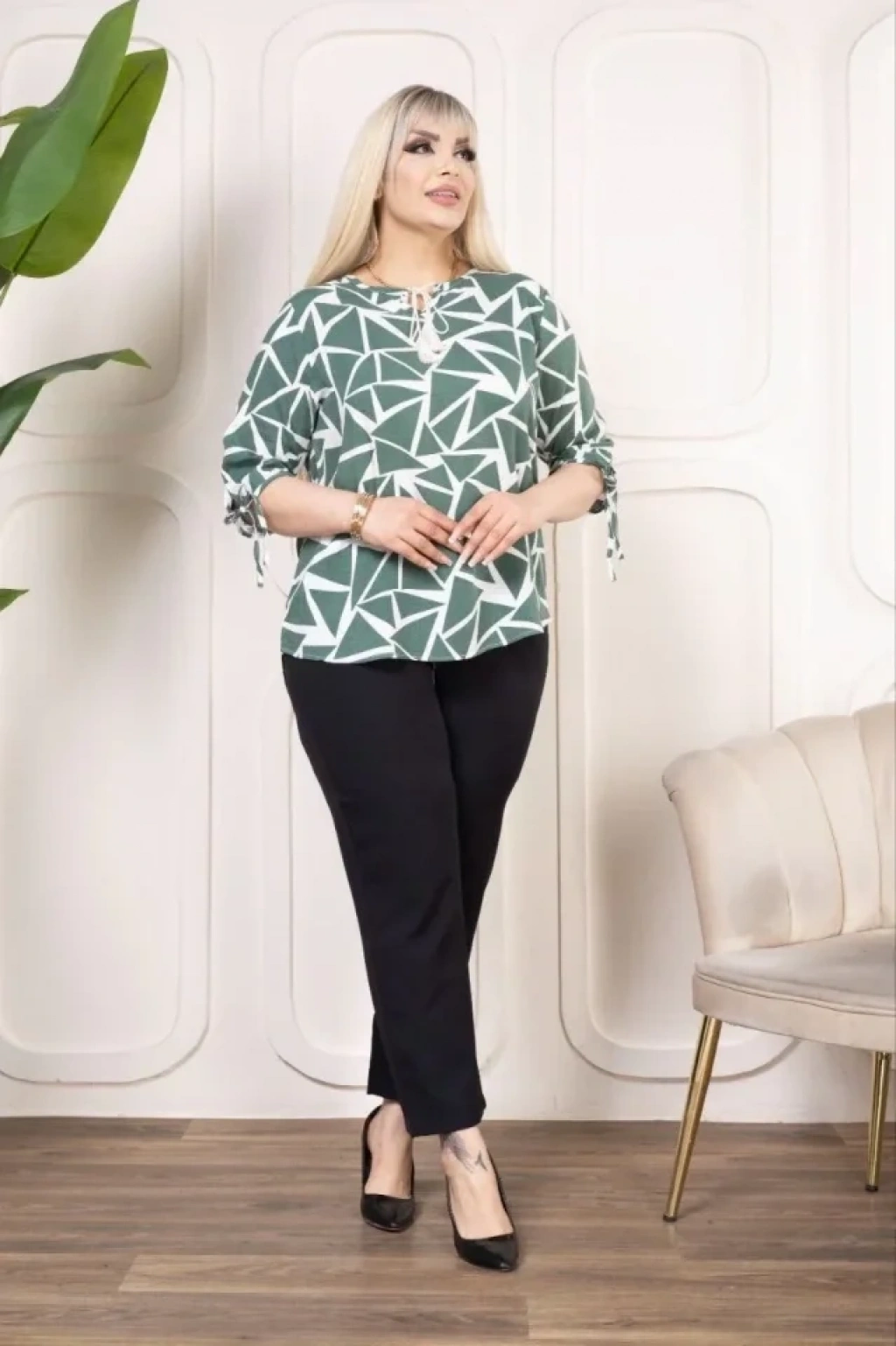 Desenli Püsküllü Viskon Bluz Bebe Yaka Kısa Kollu Big Size Rahat Kesim Desenli