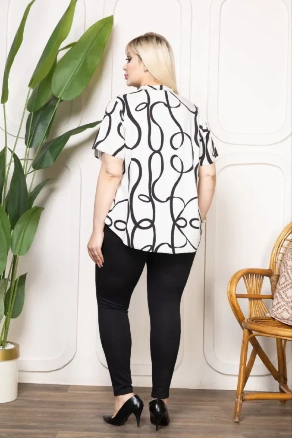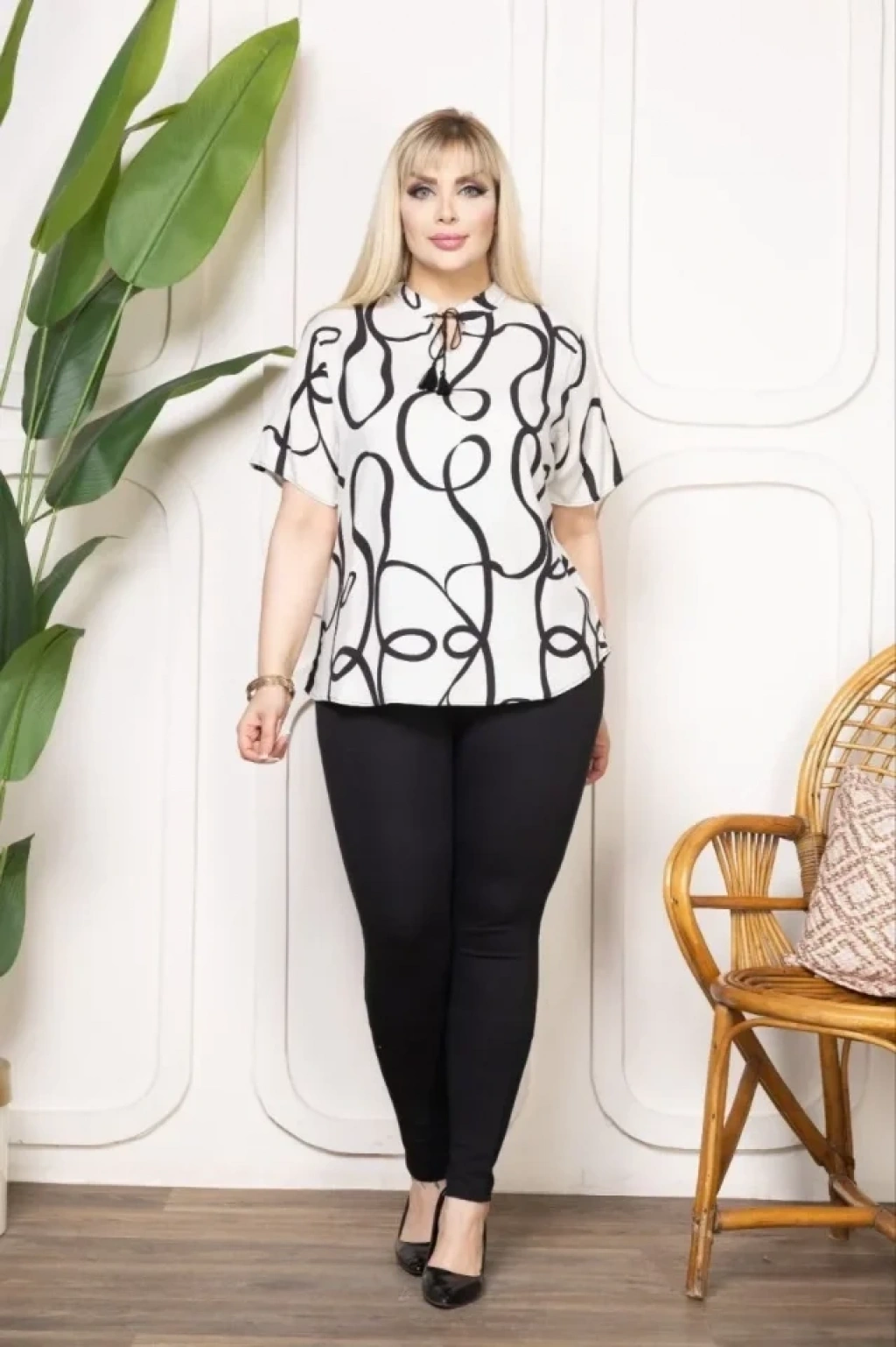 Desenli Püsküllü Viskon Bluz Bebe Yaka Kısa Kollu Big Size Rahat Kesim Desenli