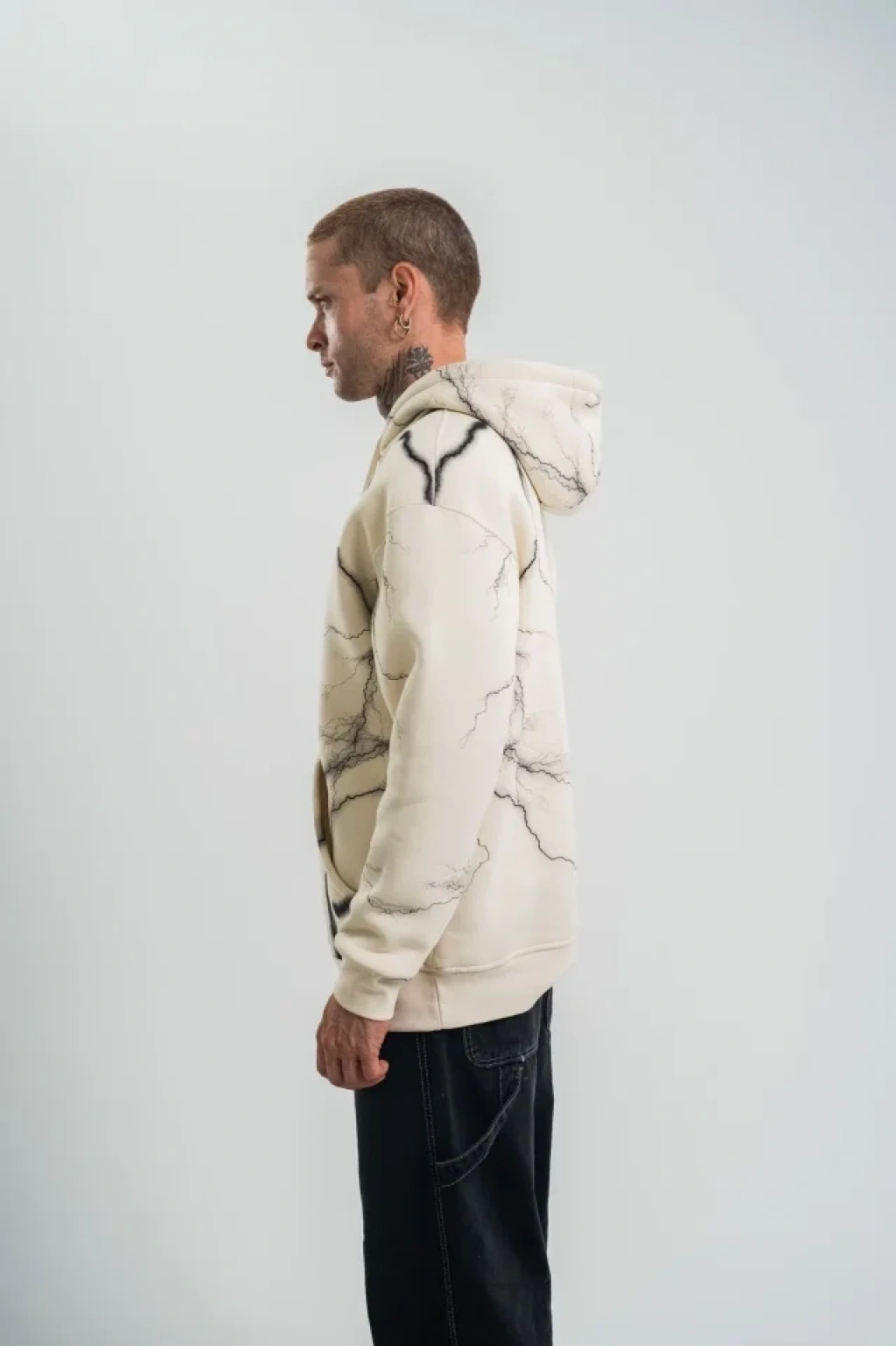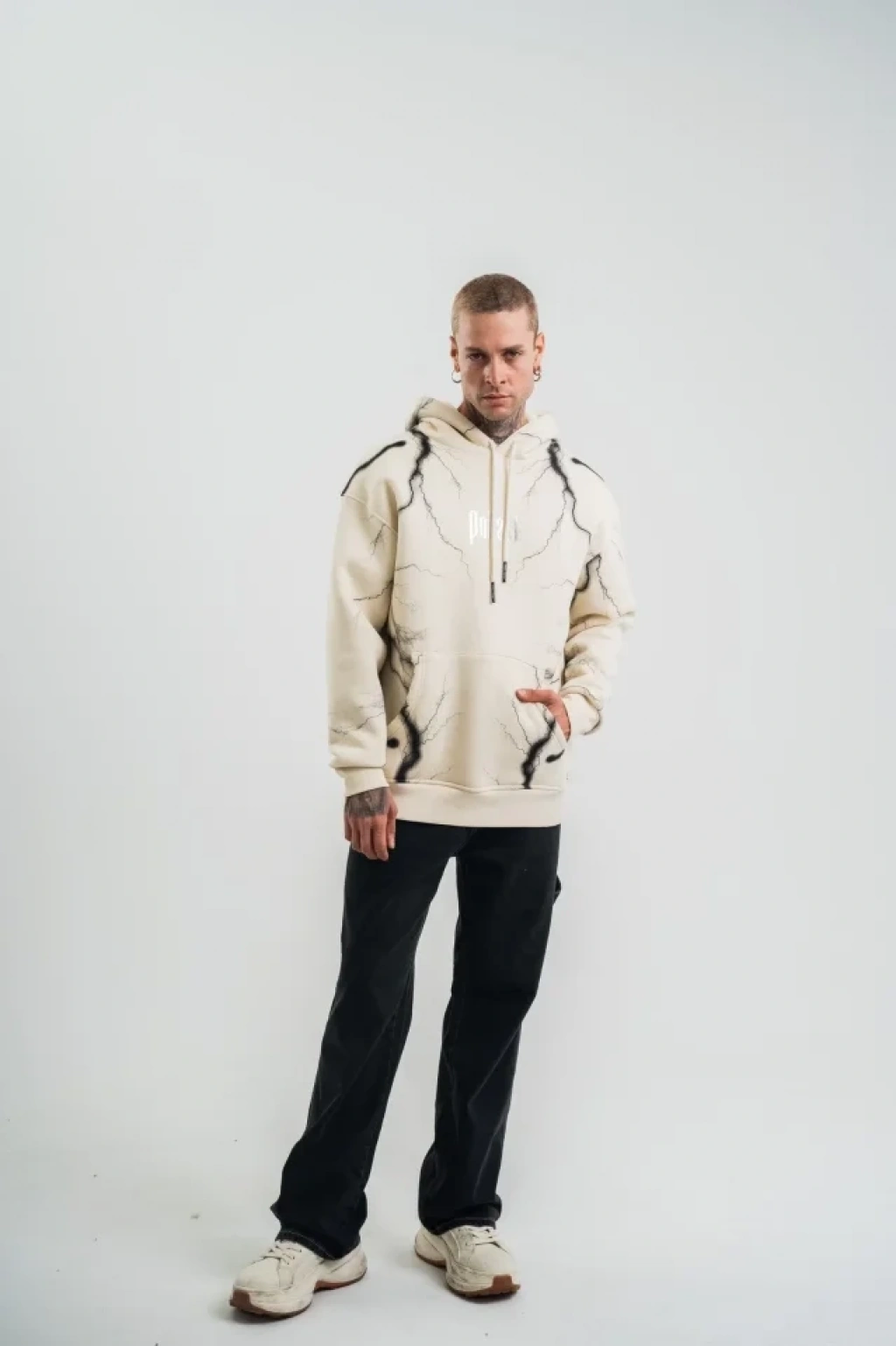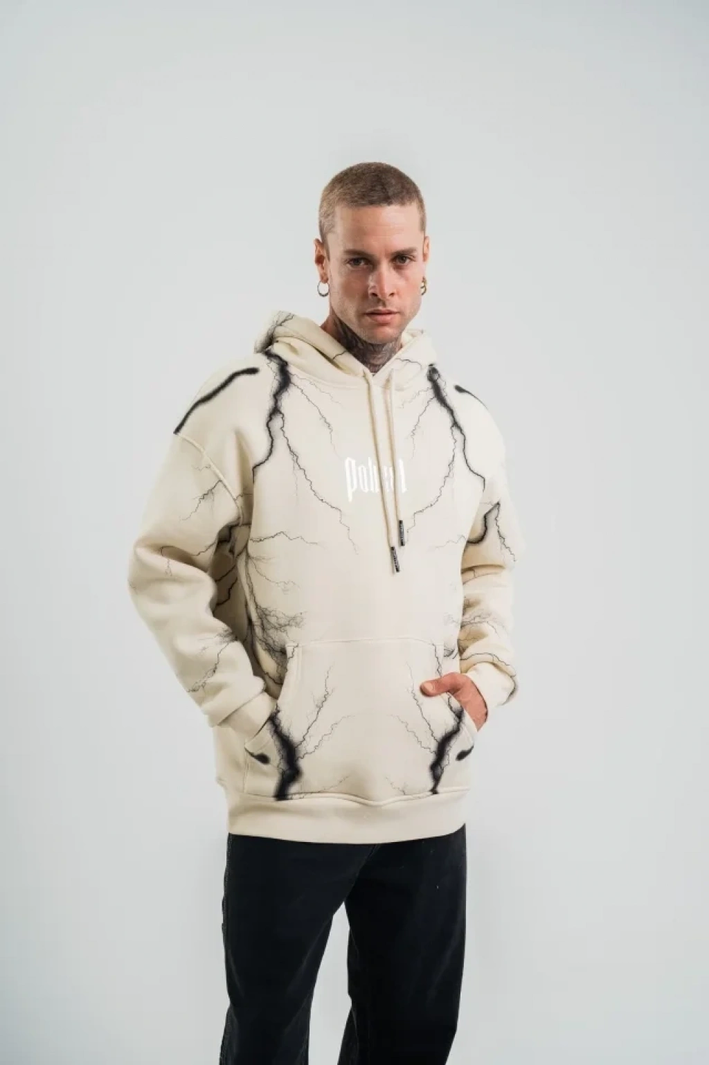Double Oversize Kapşonlu Şimşek Pano Baskılı weathirt Krem