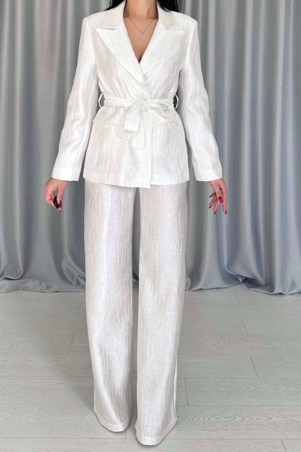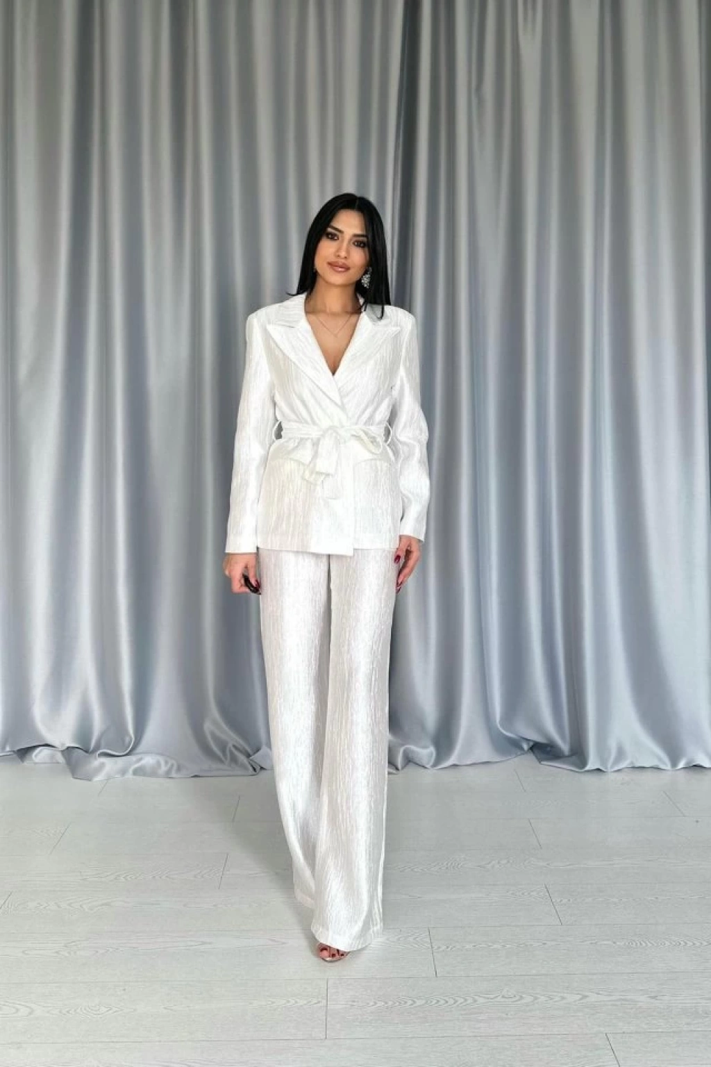 Ekru Beli Kuşaklı Ceket Ve Pantolon Parlak Takım