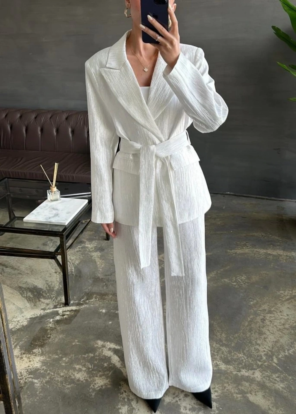 Ekru Beli Kuşaklı Ceket Ve Pantolon Parlak Takım