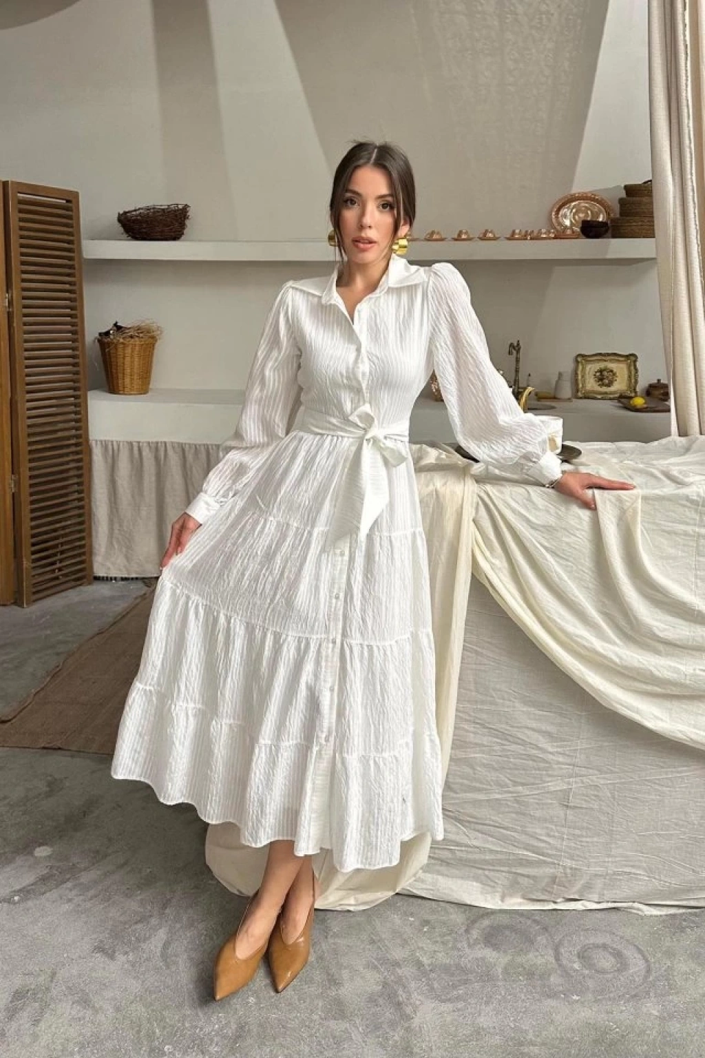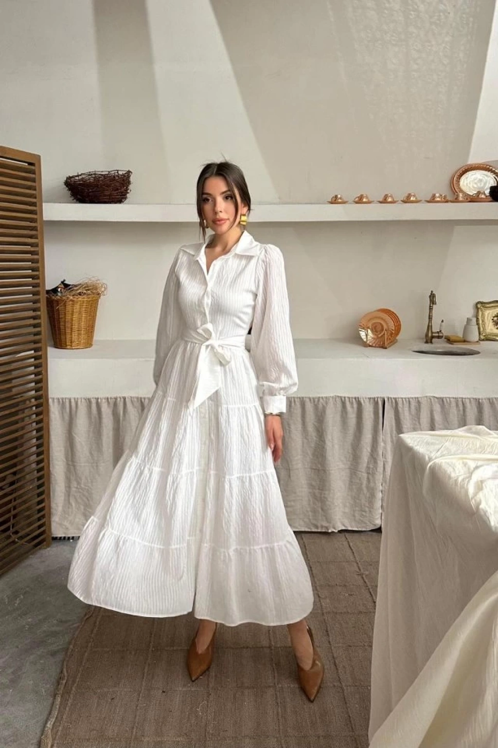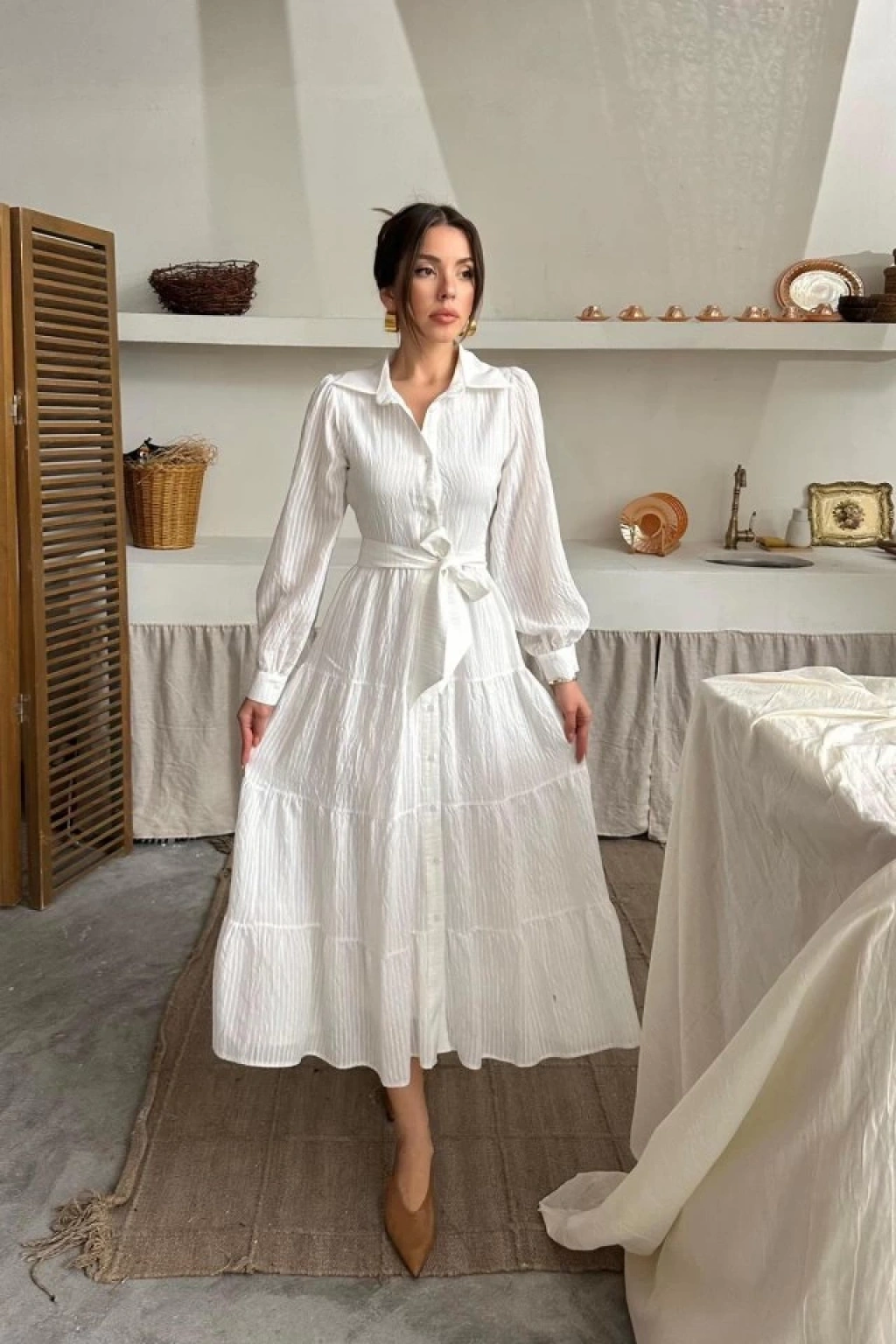 Ekru Çizgi Desenli Uzun Elbise