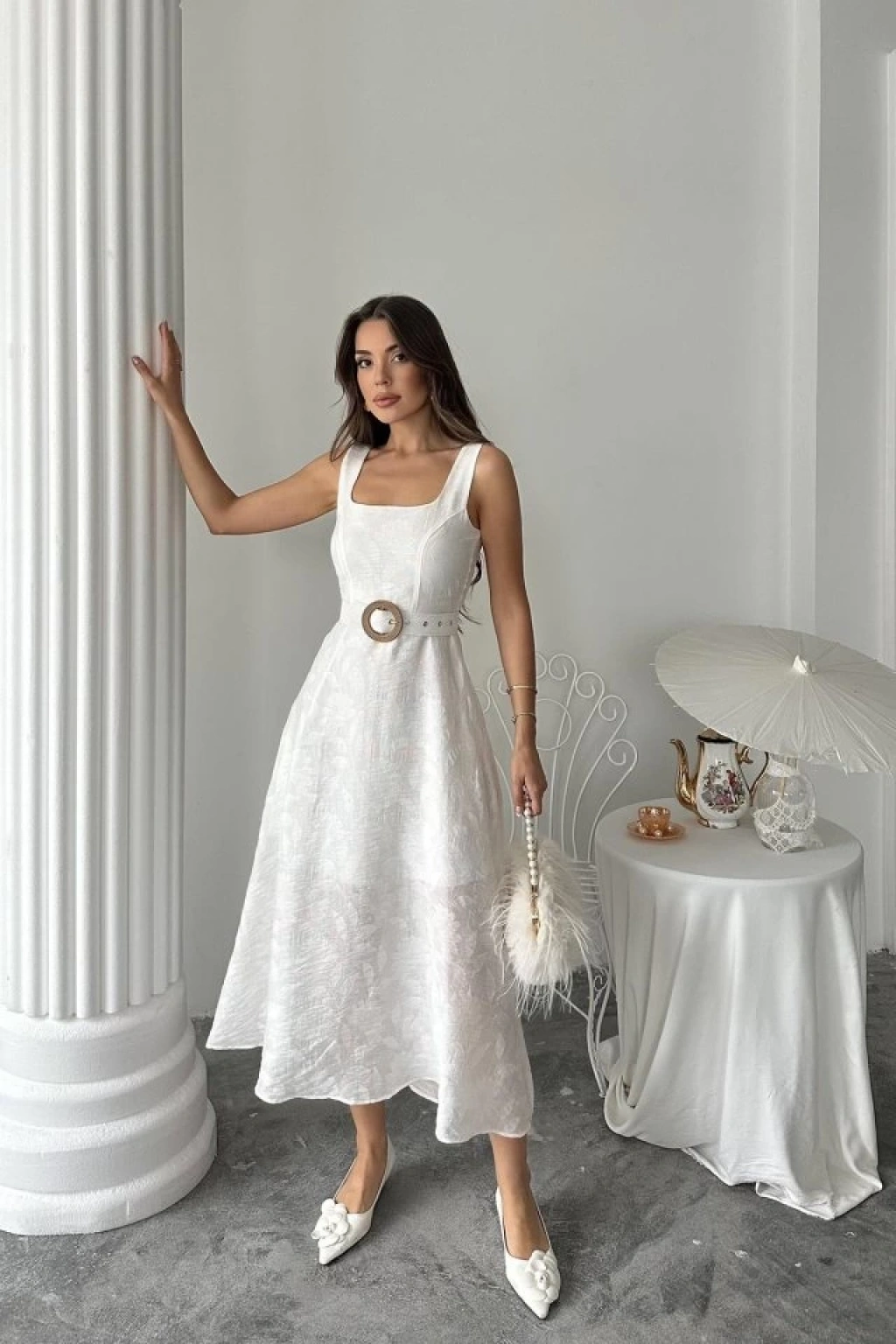 Ekru Kuplu Uzun Elbise