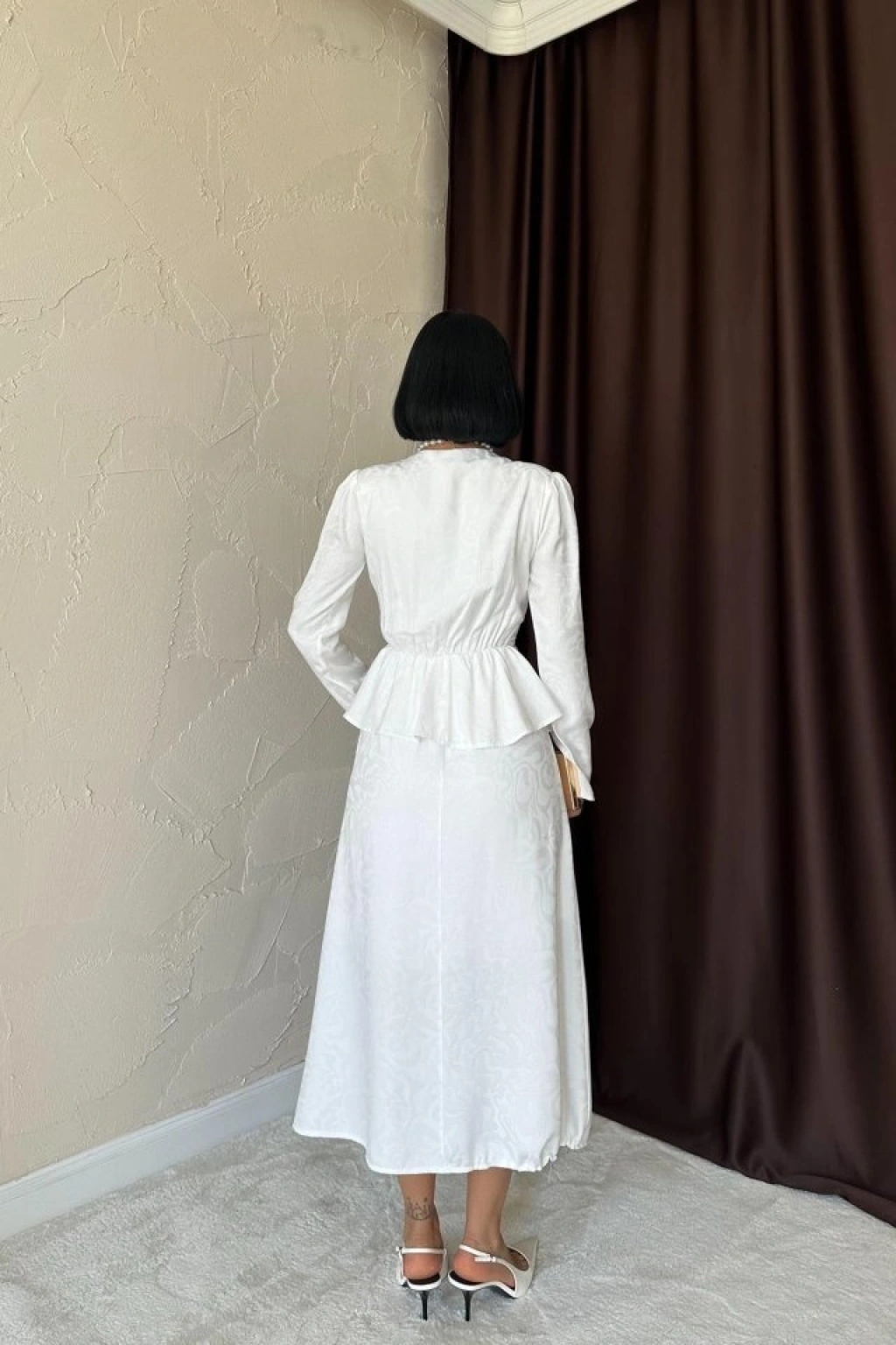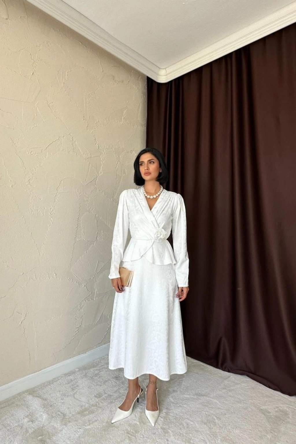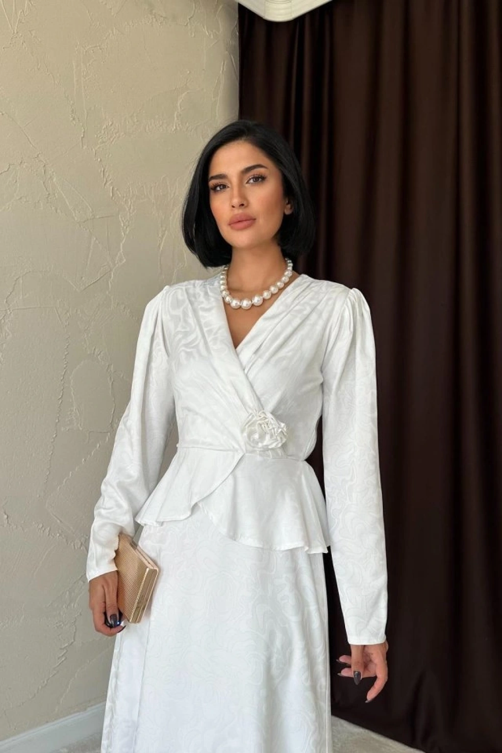 Ekru Pile Detaylı Kruvaze Elbise