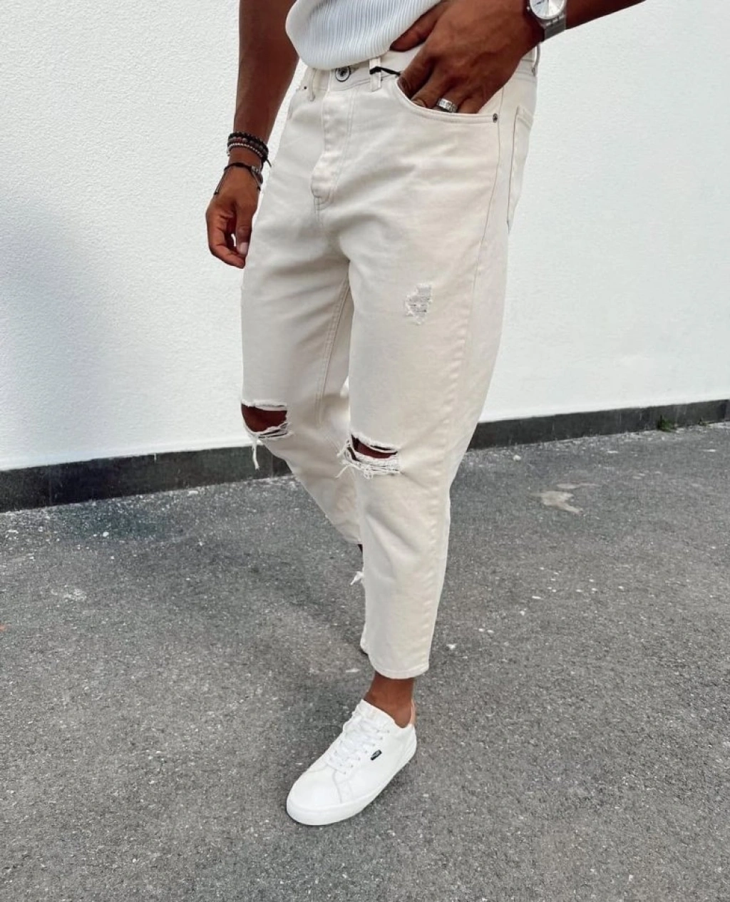 Erkek Açık Krem Yırtık Detaylı Boyfriend Jean