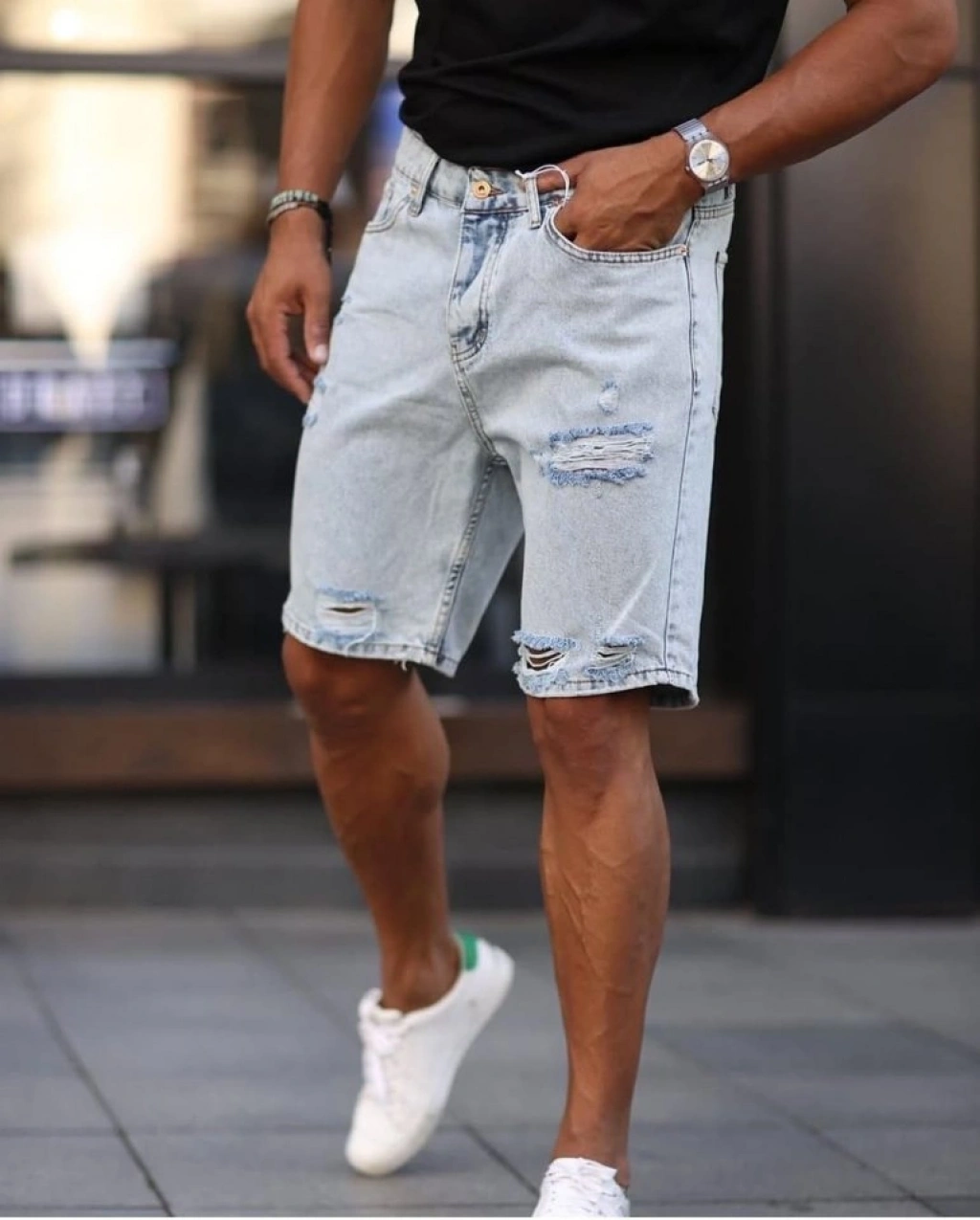 Erkek Buz Mavi Yırtık Detaylı Kot Şort