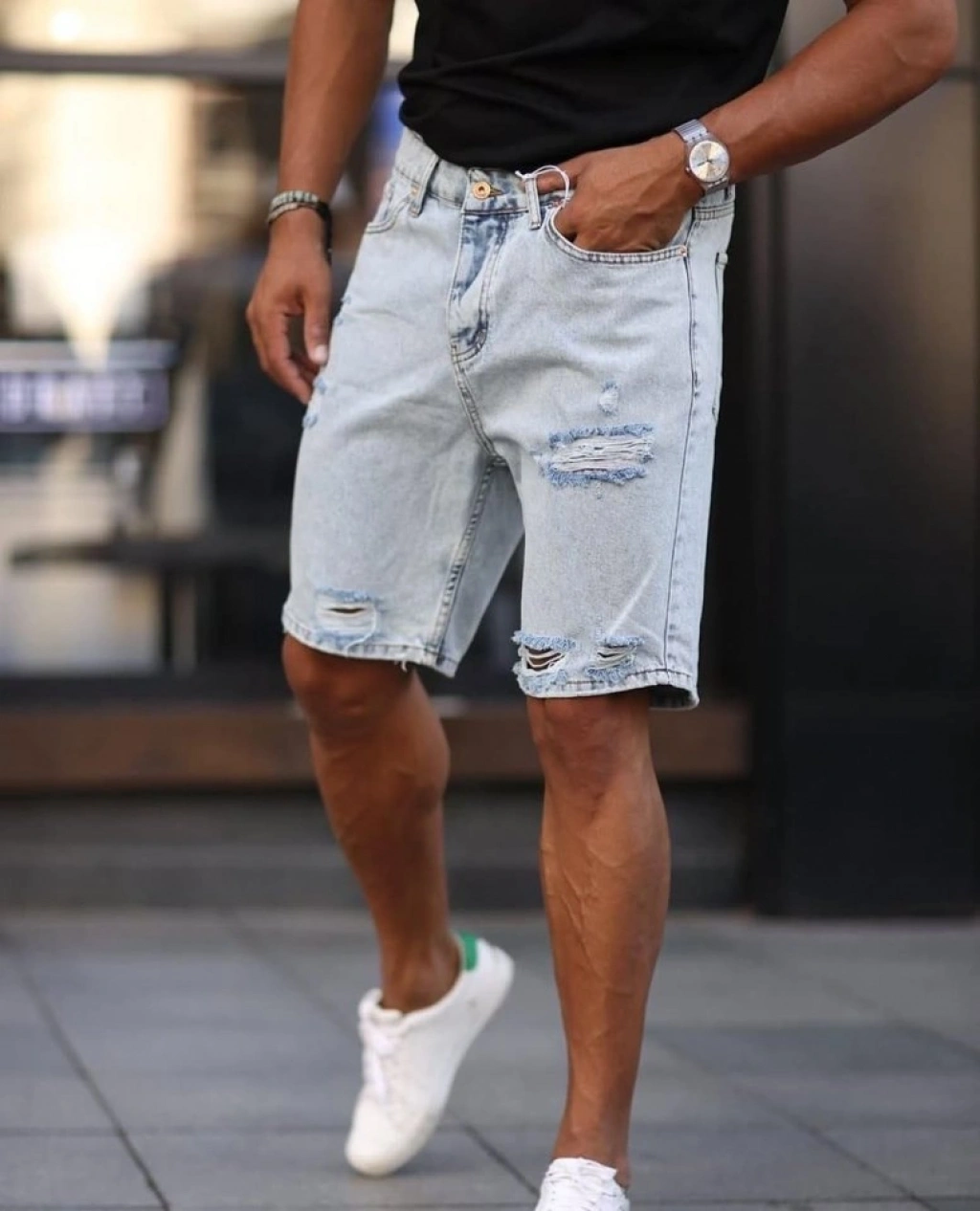 Erkek Buz Mavi Yırtık Detaylı Kot Şort