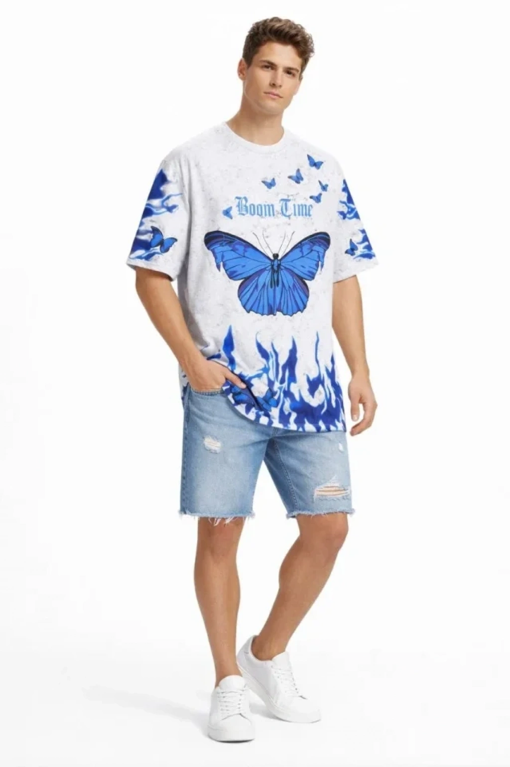 Erkek Asit Yıkamalı Oversize Tişört Mavi Kelebek Baskılı Dijital Print Bisiklet Yaka Streetwear T-Shirt - Beyaz