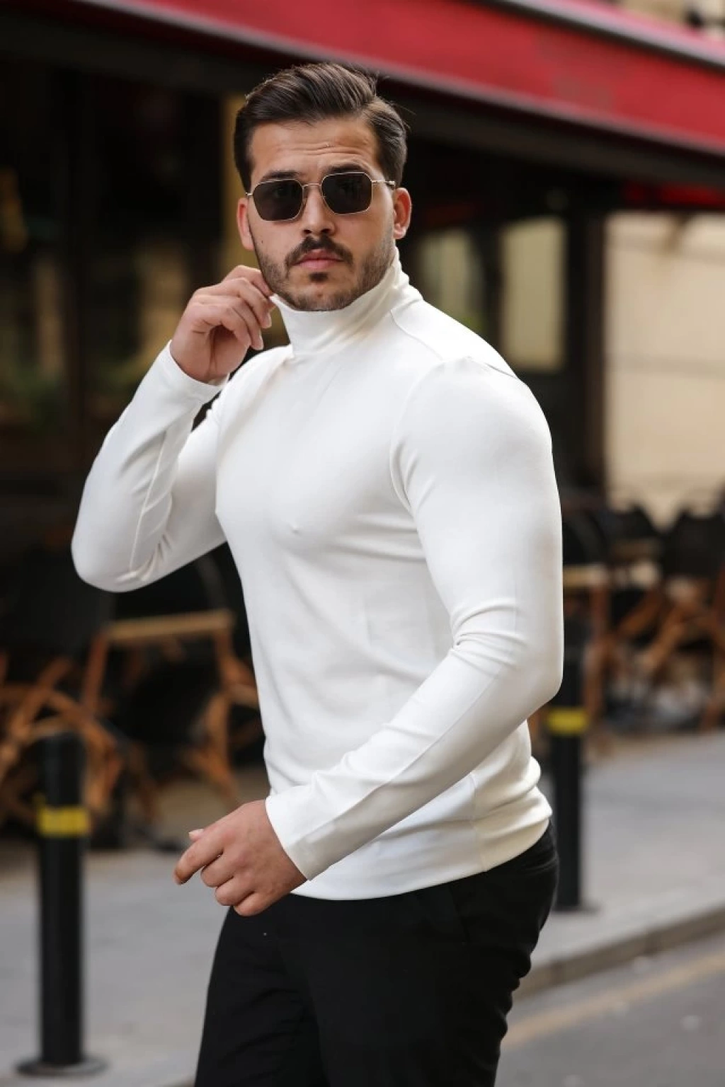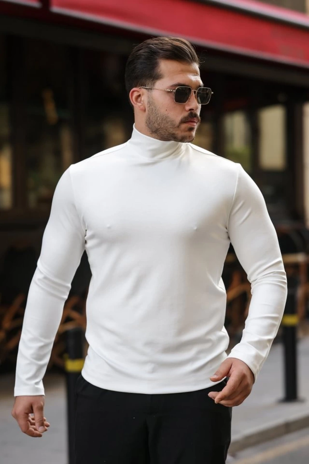 Erkek Bisiklet Yuvarlak Yaka Triko Kazak Pamuklu Kalın Fitilli Dokuma, Regular Fit Uzun Kollu Kışlık odel Beyaz