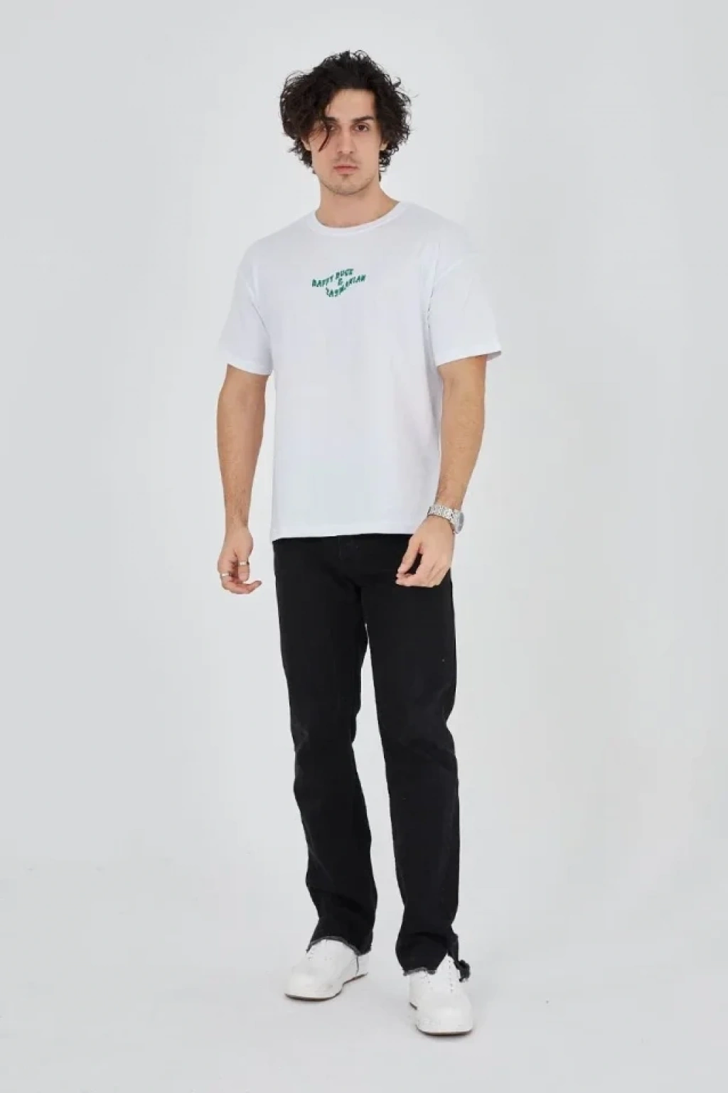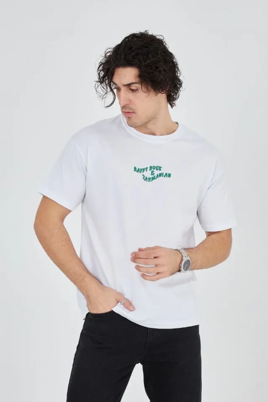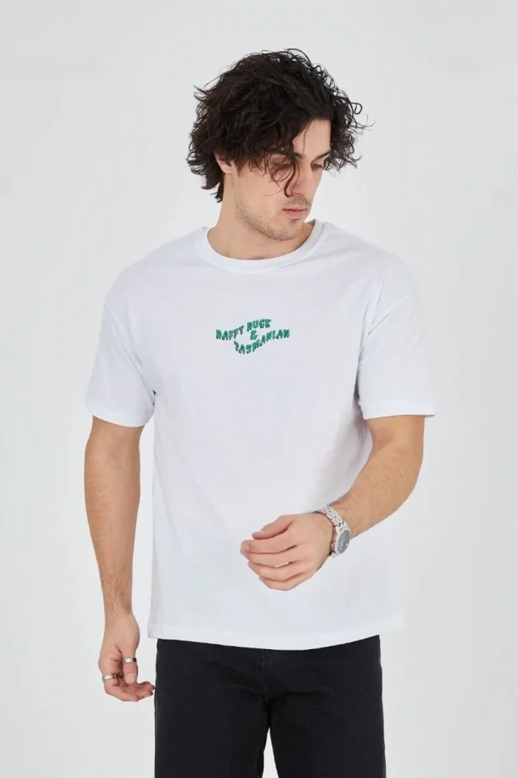 Erkek Asit Yıkama Bisiklet Yaka Kısa Kollu Oversize Thirt Tişört Beyaz
