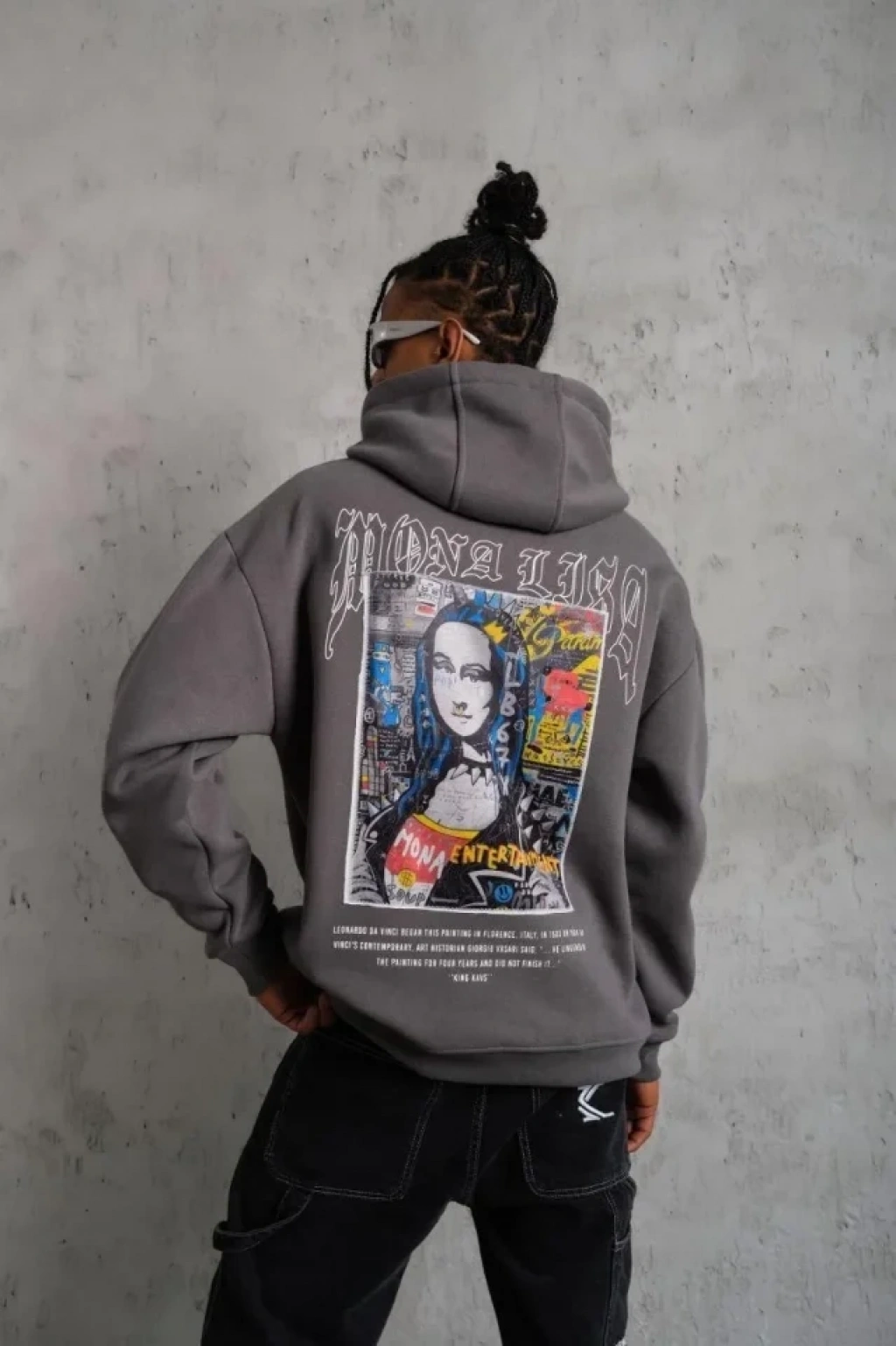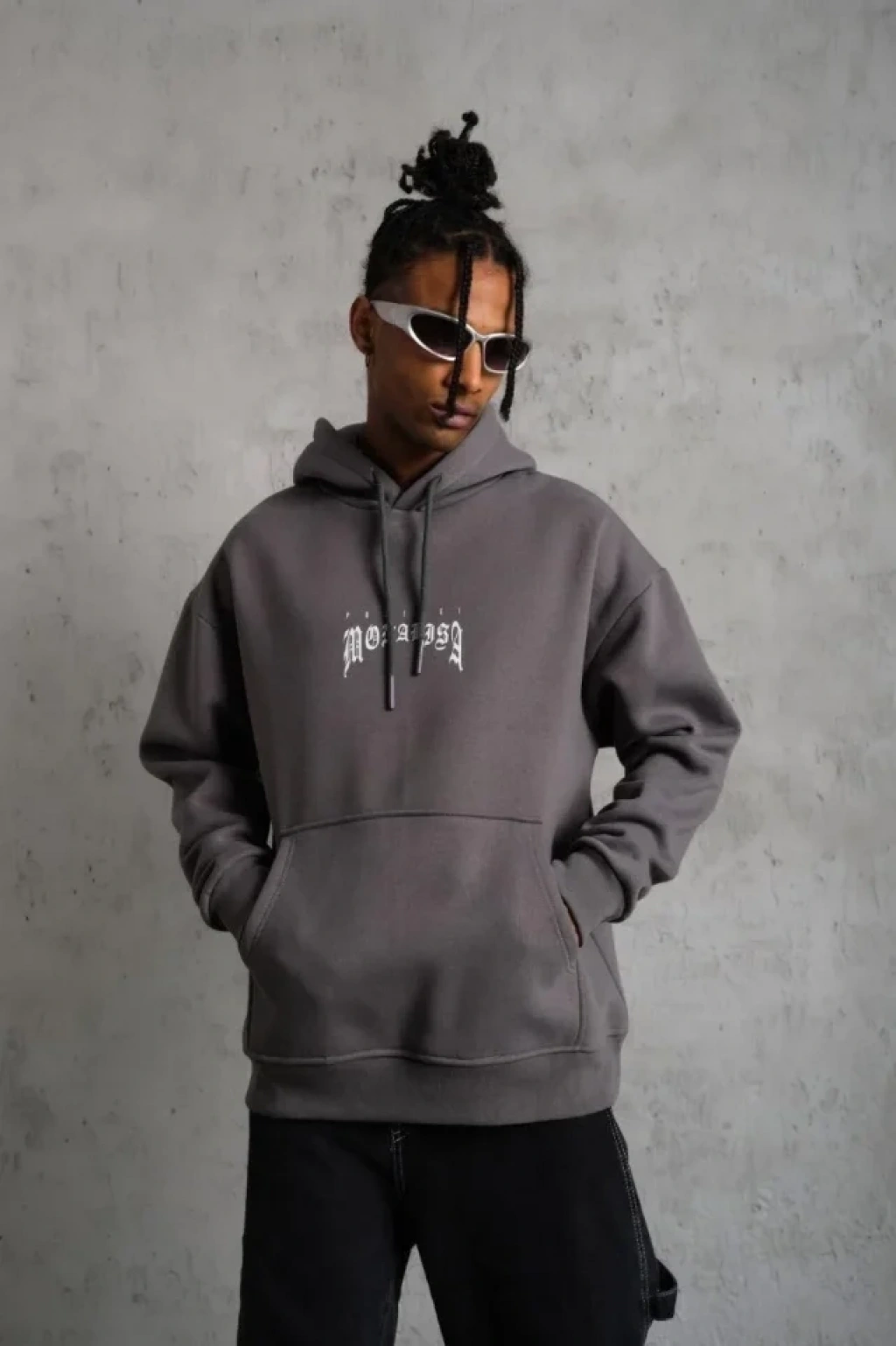 Erkek Baskılı Kapüşonlu Ve Kanguru Cepli weat Gri