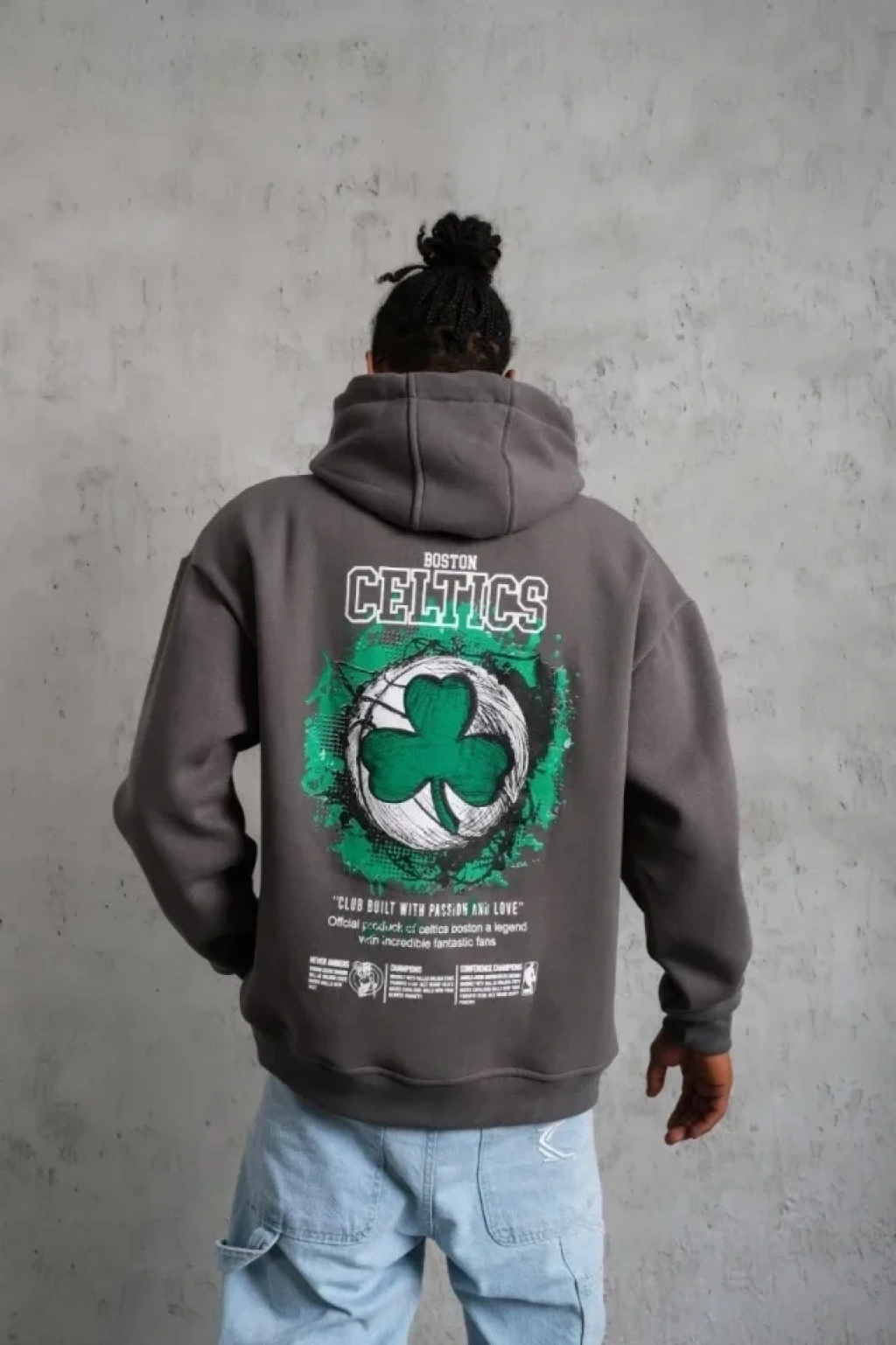 Erkek Baskılı Kapüşonlu Ve Kordon İpli weat Gri
