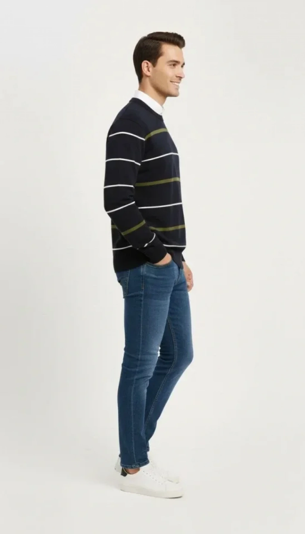 Erkek Bisiklet Yaka Cizgili Triko Kazak Yumuşak Dokulu Pamuklu Ince Dokuma, Uzun Kollu Rahat Regular Kalıp - Lacivert