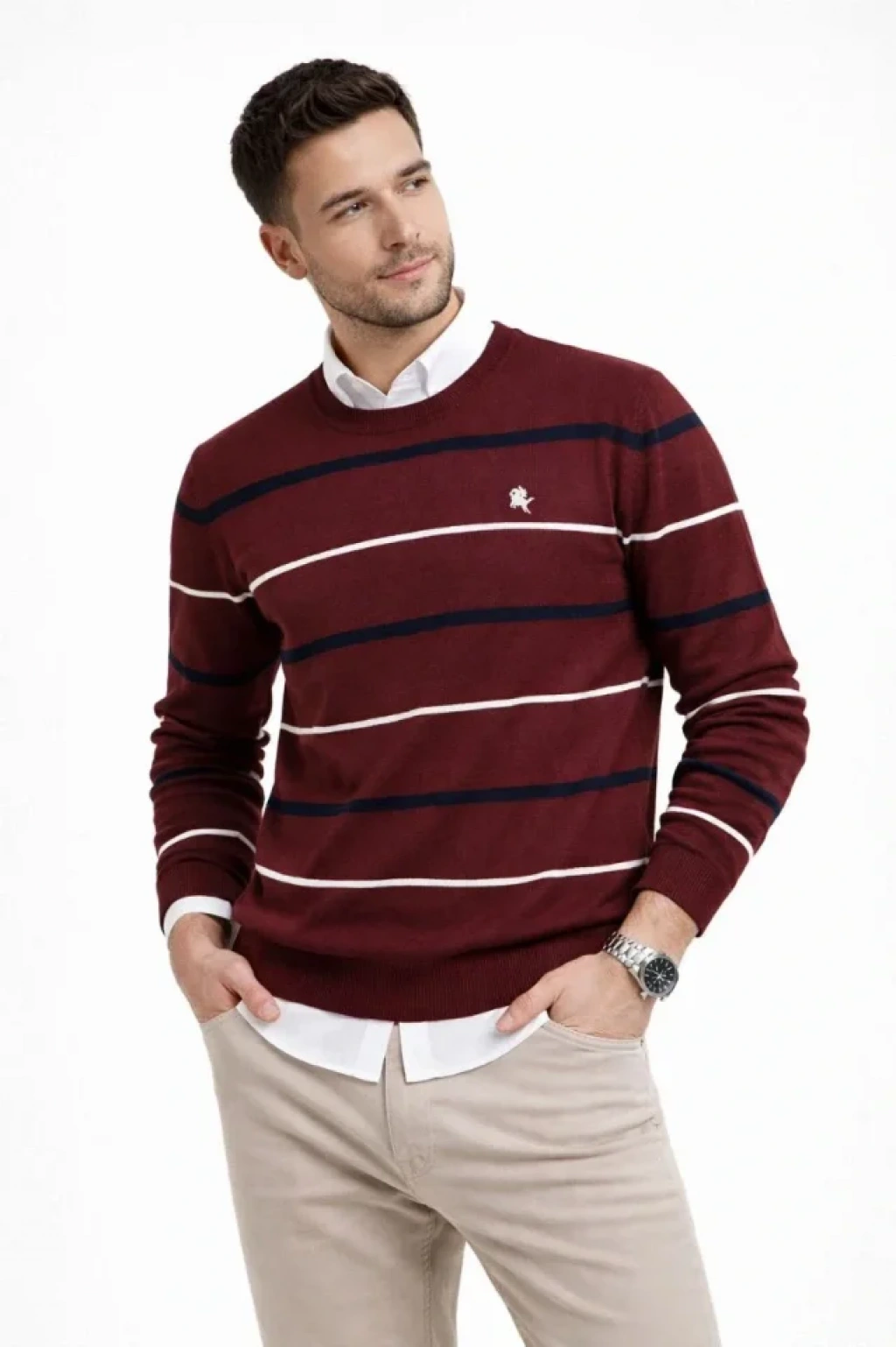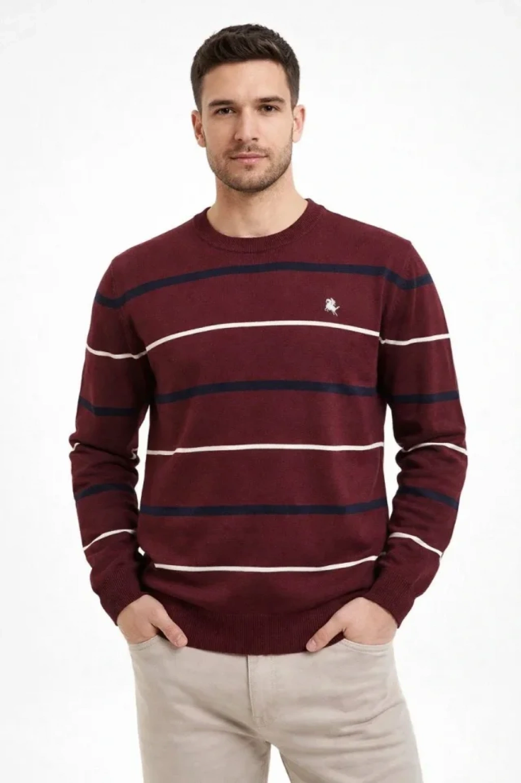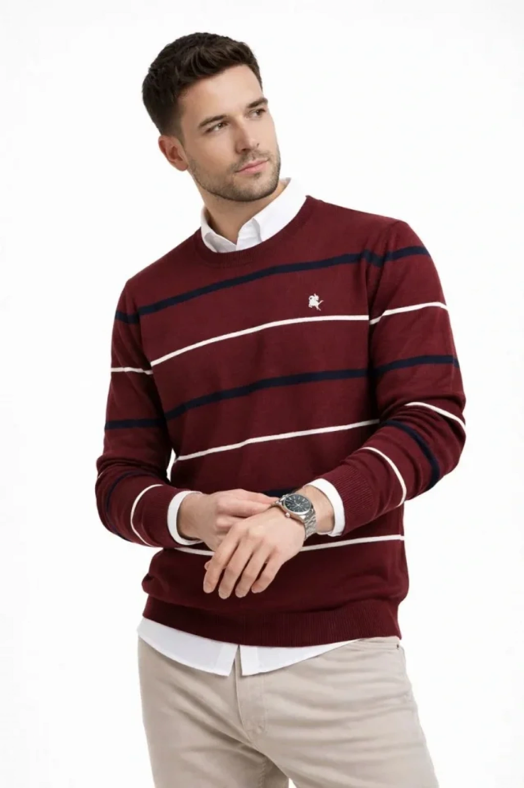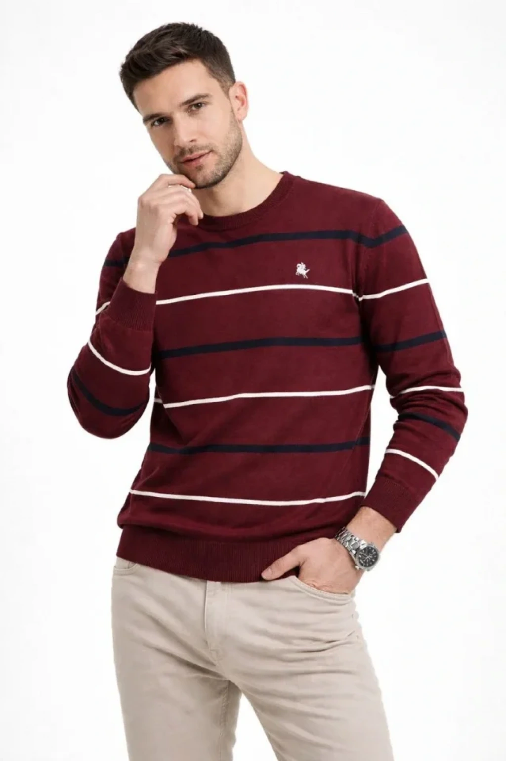 Erkek Bisiklet Yaka Cizgili Triko Kazak Yumuşak Dokulu Pamuklu Ince Dokuma, Uzun Kollu Rahat Regular Kalıp - Bordo