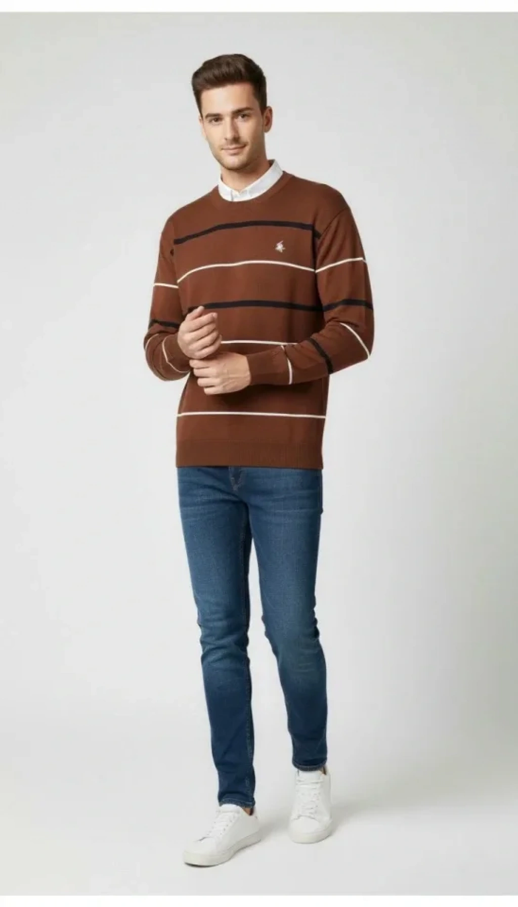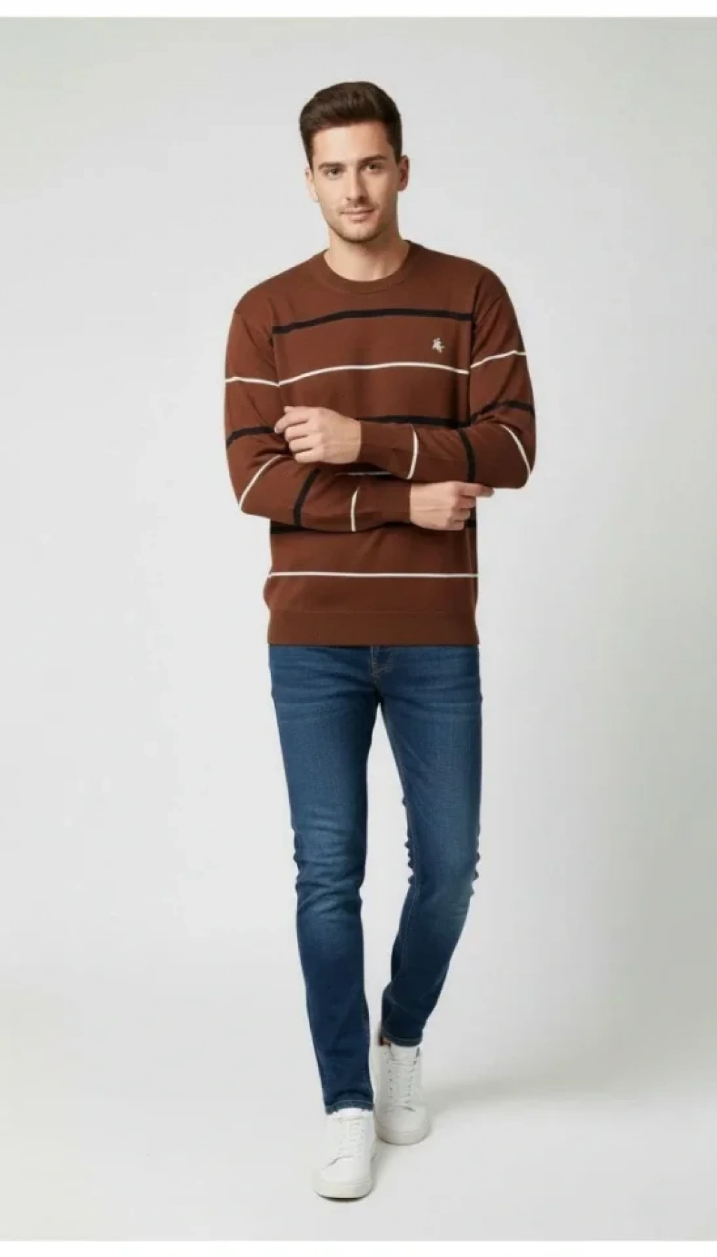 Erkek Bisiklet Yaka Cizgili Triko Kazak Yumuşak Dokulu Pamuklu Ince Dokuma, Uzun Kollu Rahat Regular Kalıp - Kahverengi