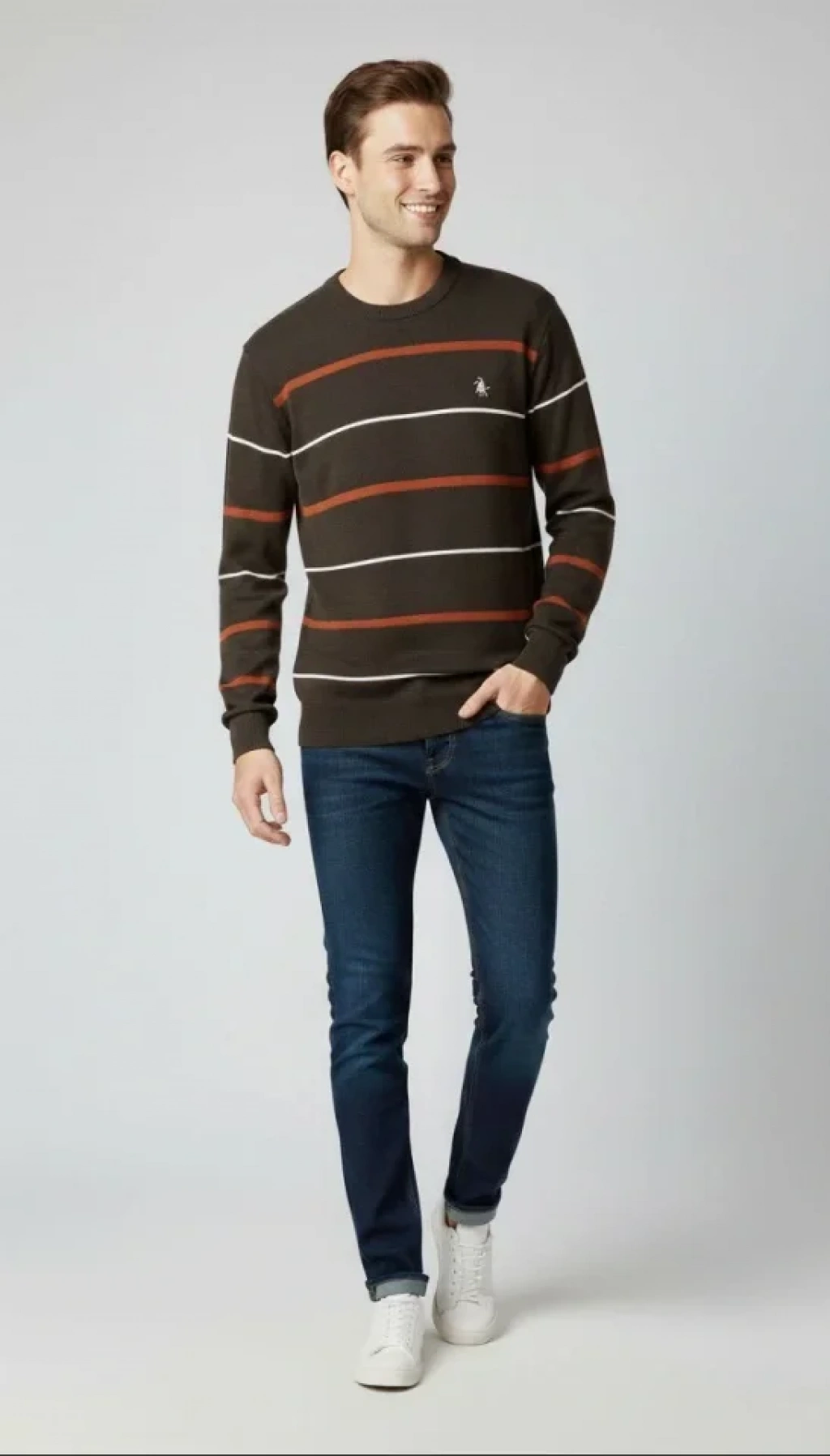 Erkek Bisiklet Yaka Cizgili Triko Kazak Yumuşak Dokulu Pamuklu Ince Dokuma, Uzun Kollu Rahat Regular Kalıp - Koyu Kahverengi