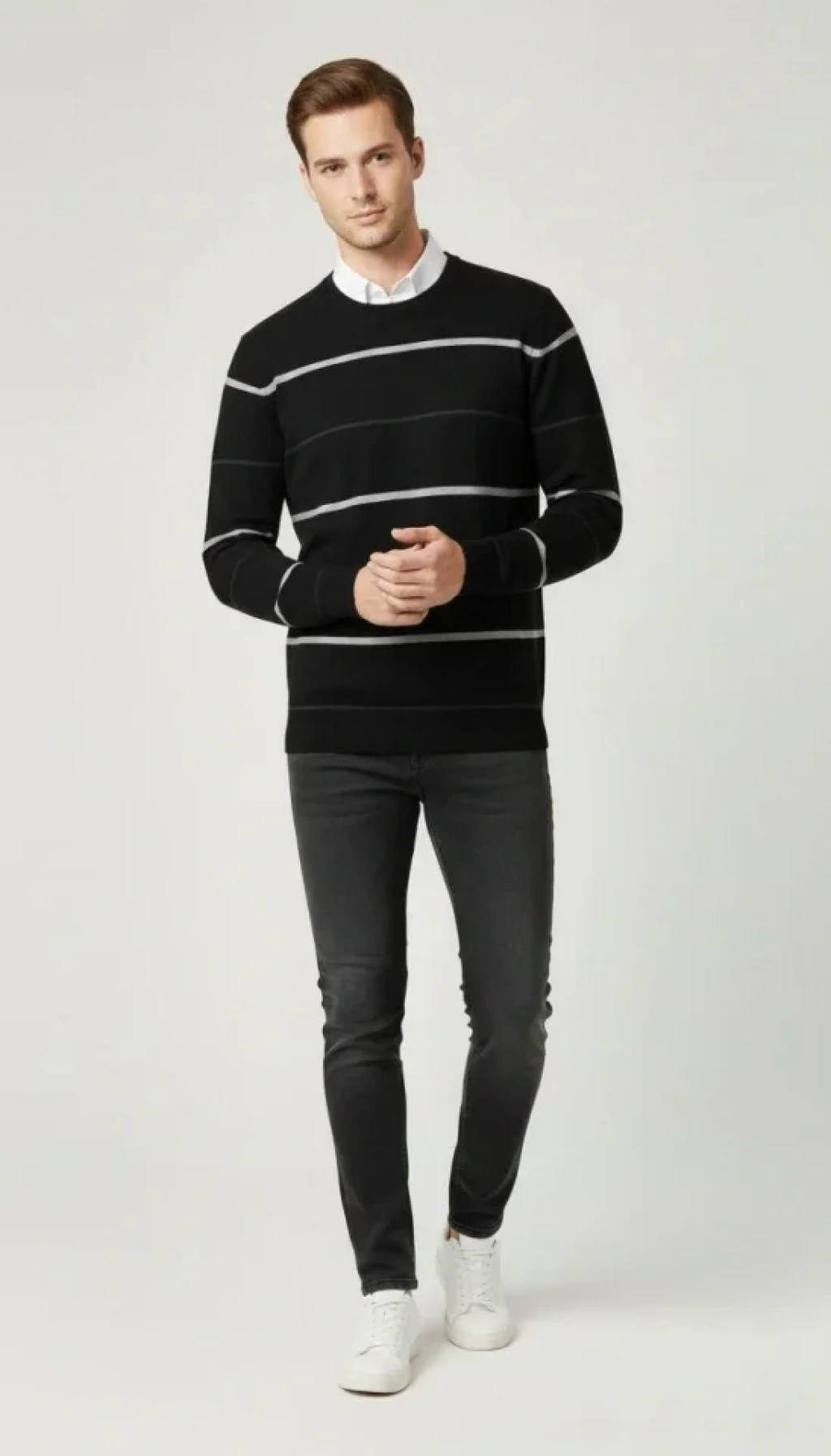 Erkek Bisiklet Yaka Cizgili Triko Kazak Yumuşak Dokulu Pamuklu Ince Dokuma, Uzun Kollu Rahat Regular Kalıp - Siyah