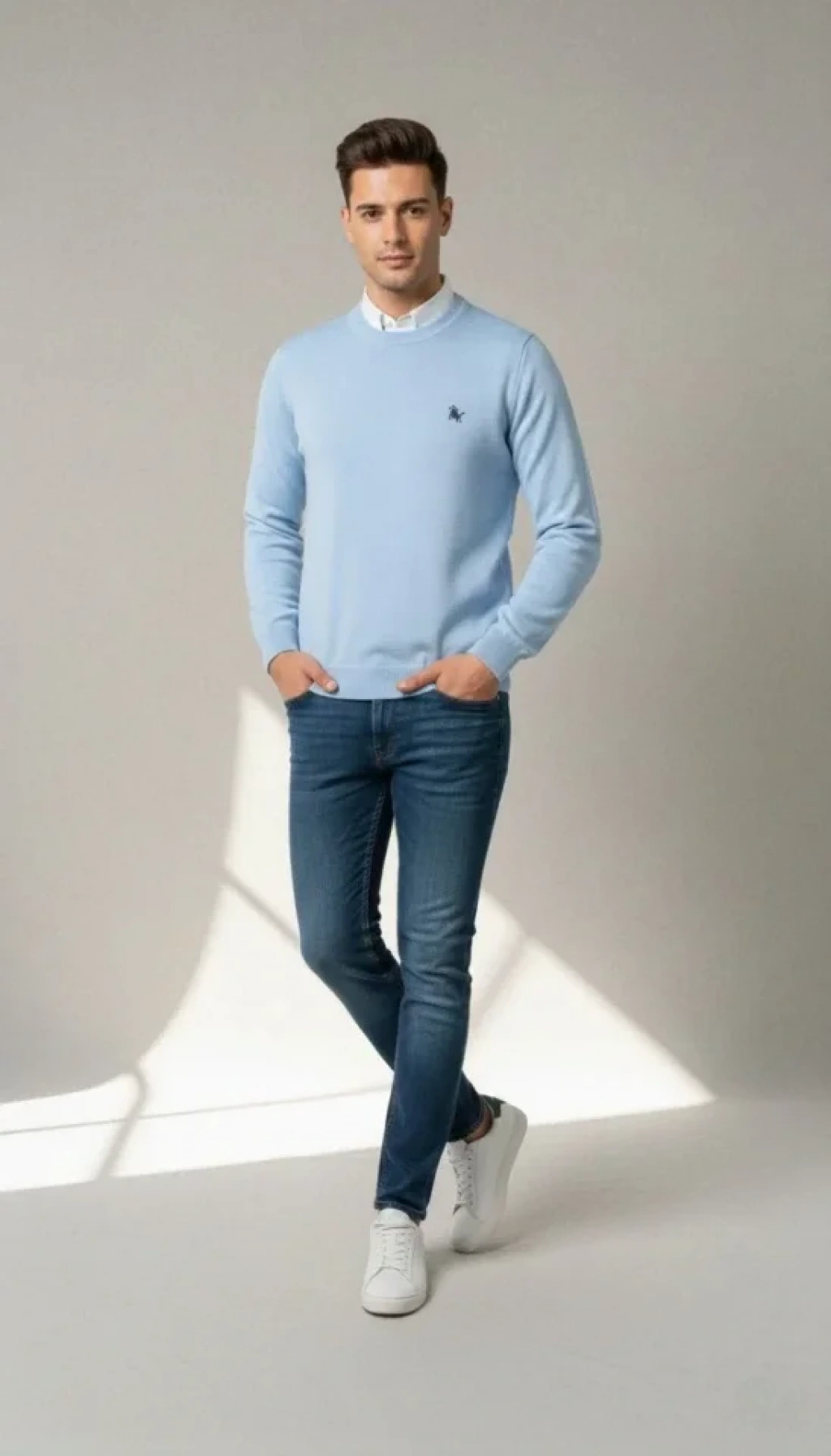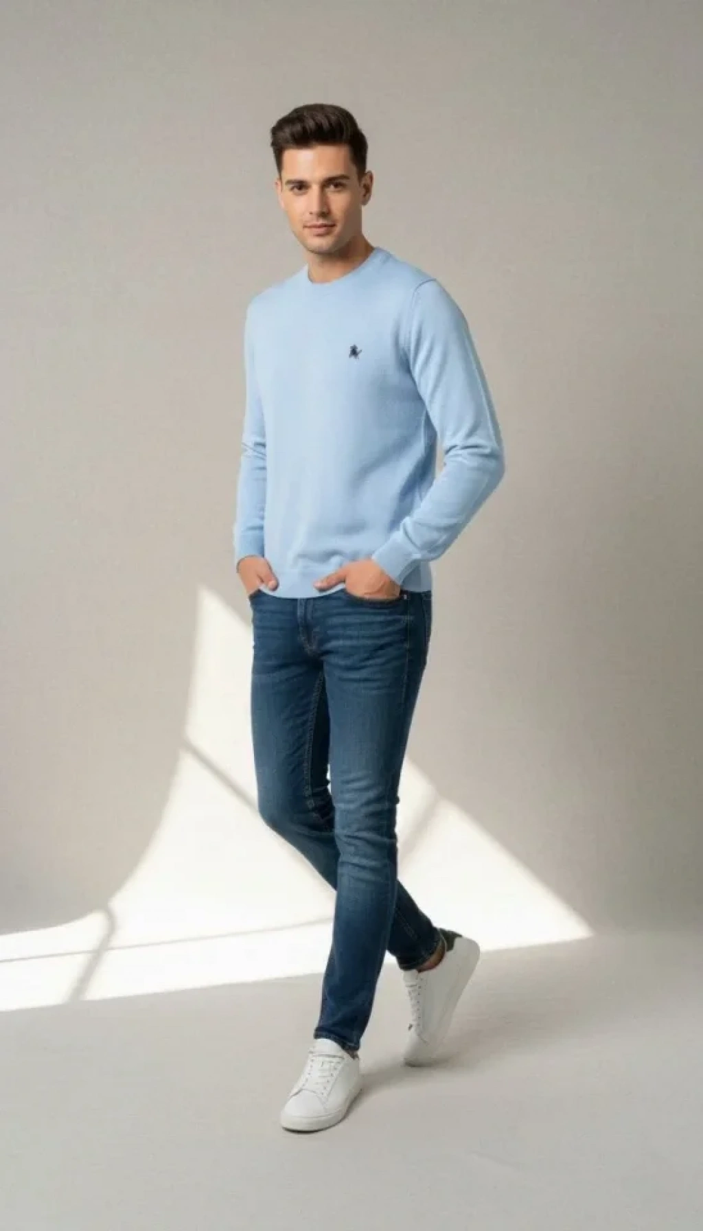 Erkek Bisiklet Yaka Nakış Işlemeli Triko Kazak Yumuşak Dokulu Pamuklu Ince Dokuma, Uzun Kollu Rahat Regular Kalıp - Mavi