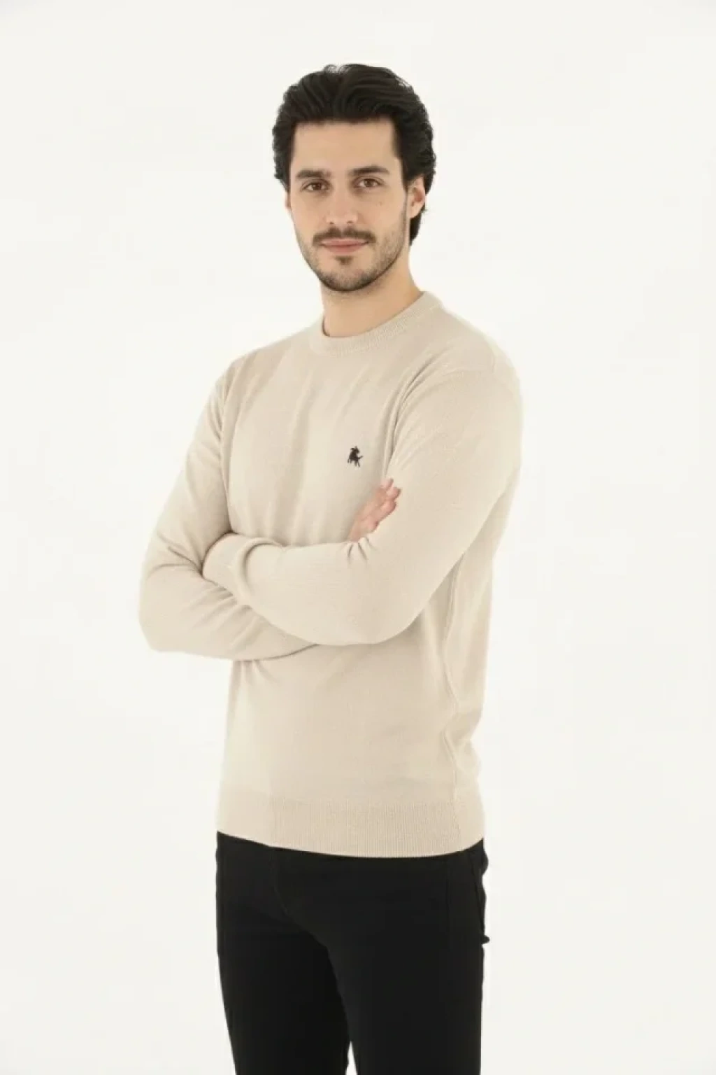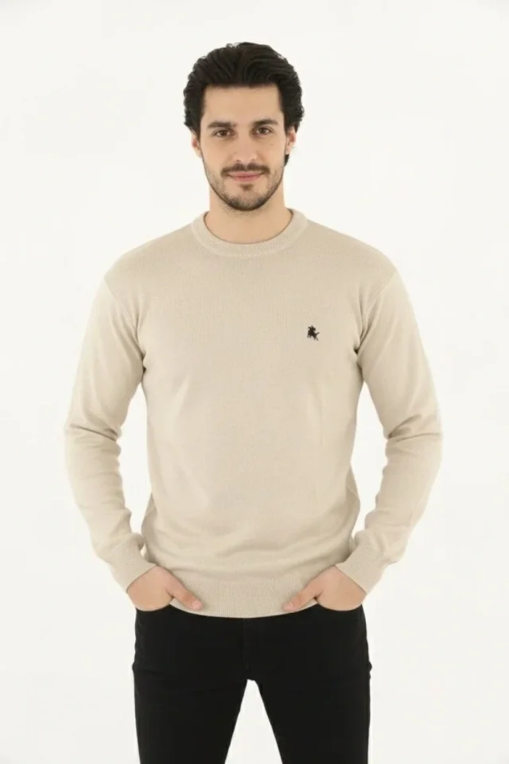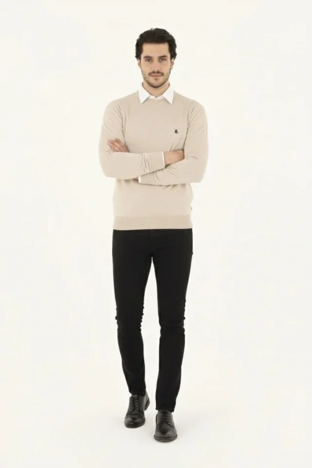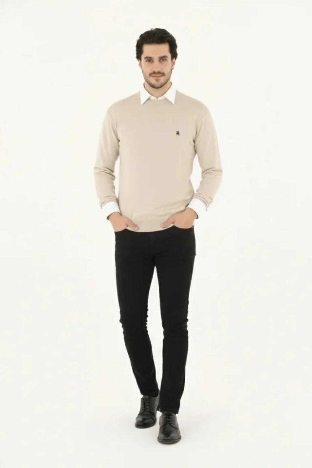 Erkek Bisiklet Yaka Nakış Işlemeli Triko Kazak Yumuşak Dokulu Pamuklu Ince Dokuma, Uzun Kollu Rahat Regular Kalıp - Bej