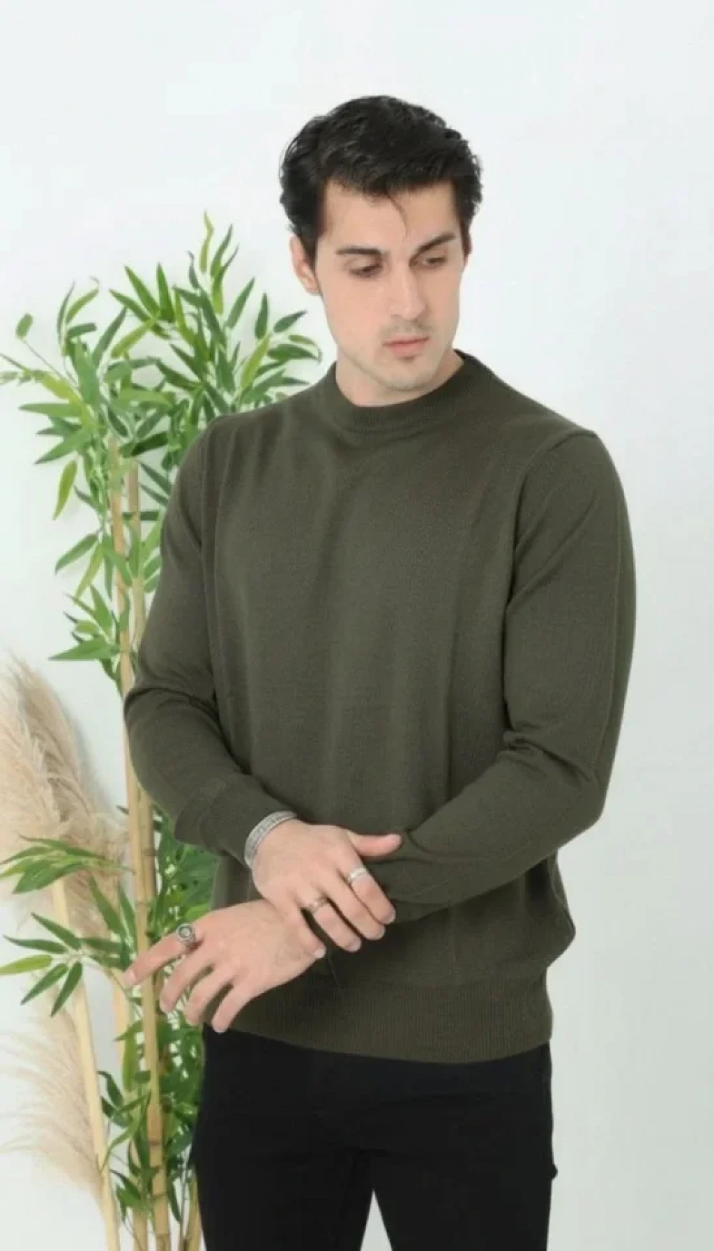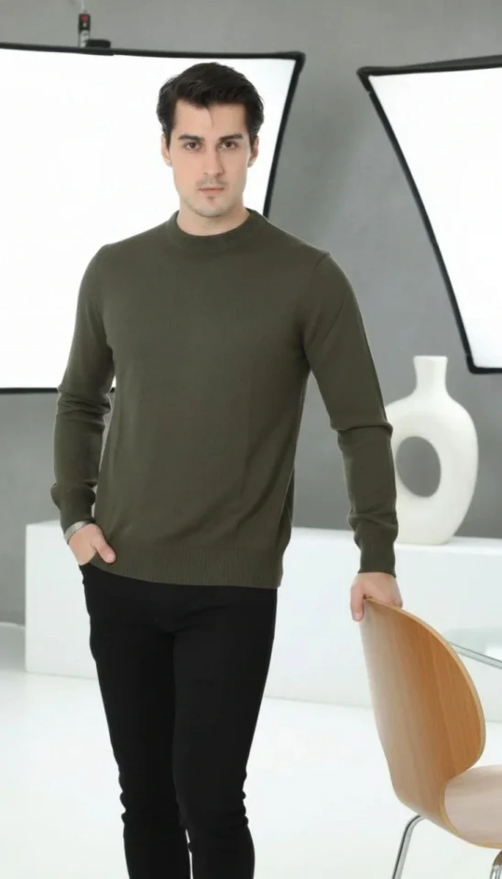 Erkek Bisiklet Yaka Triko Kazak Yumuşak Dokulu Pamuklu Ince Dokuma, Uzun Kollu Rahat Regular Kalıp - Haki