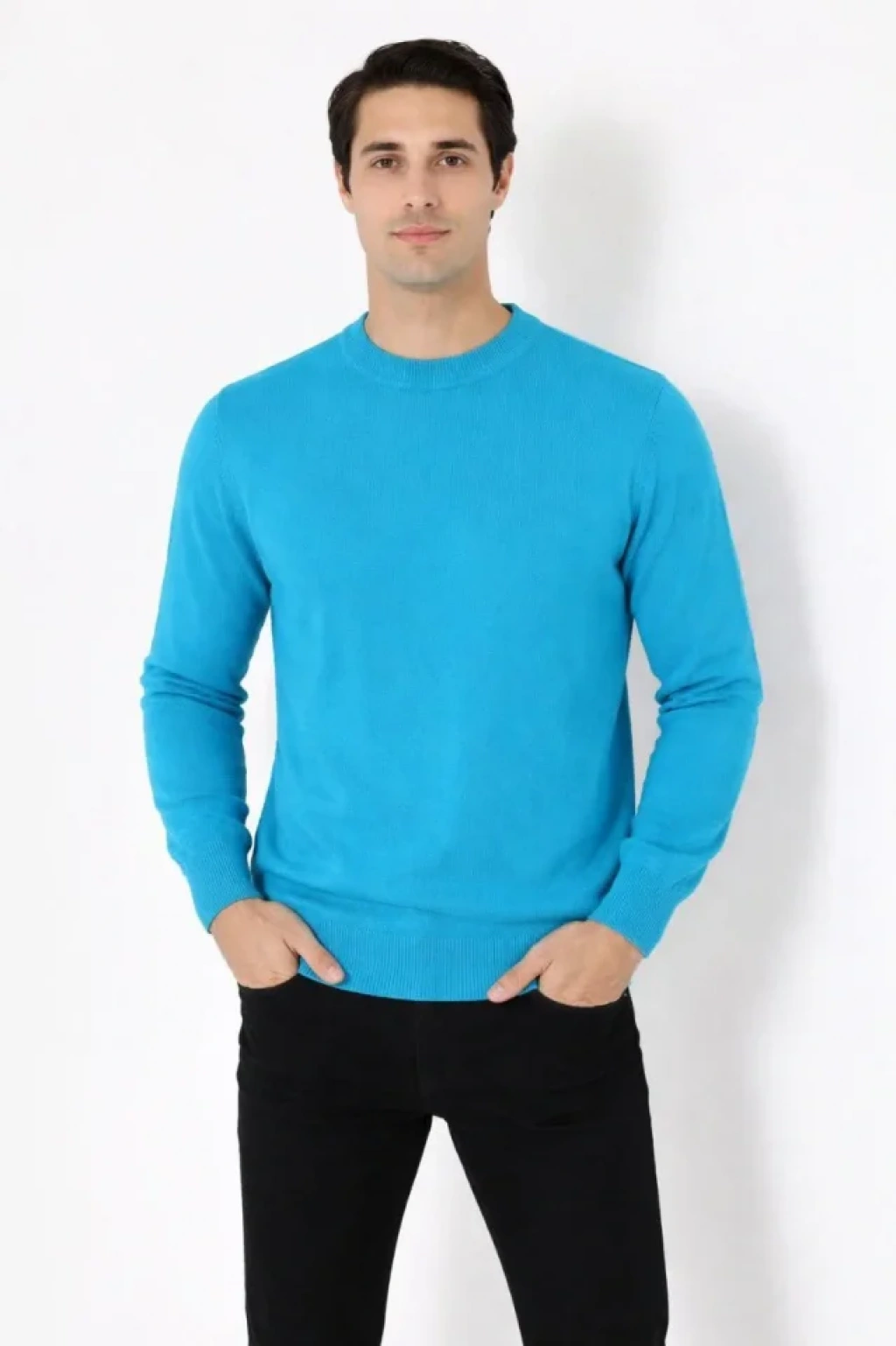 Erkek Bisiklet Yaka Triko Kazak Yumuşak Dokulu Pamuklu Ince Dokuma, Uzun Kollu Rahat Regular Kalıp - Mavi