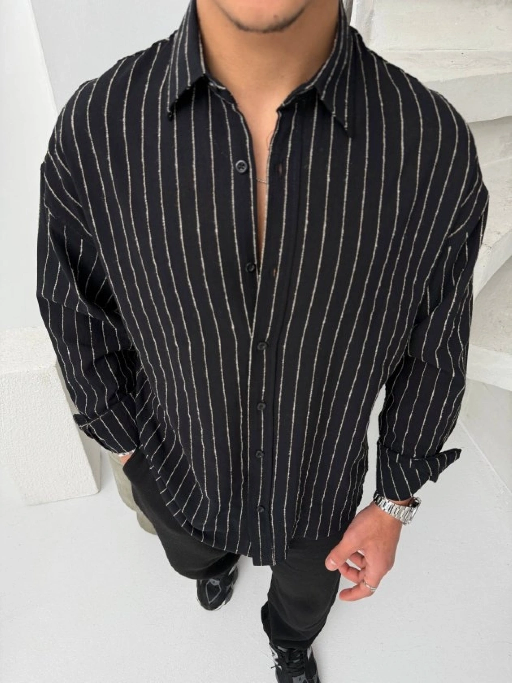 Erkek KETEN Kumaş Oversize Uzun Kollu Rahat Kalıp Gömlek iyah