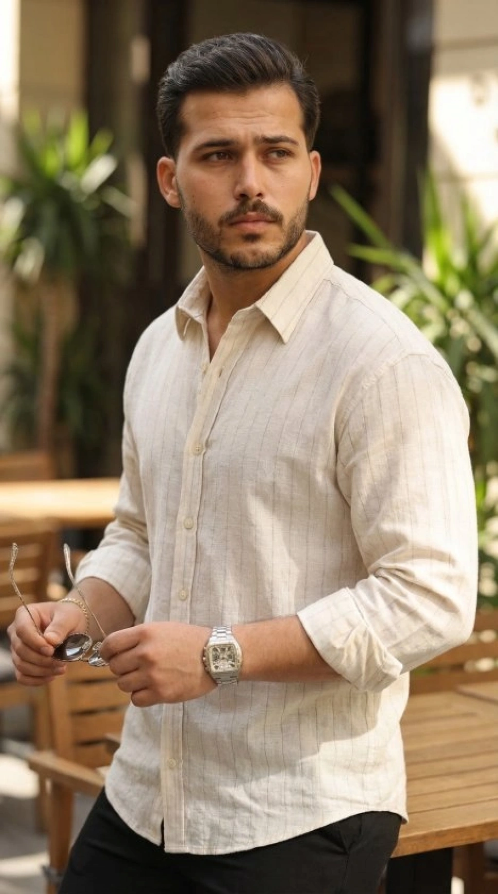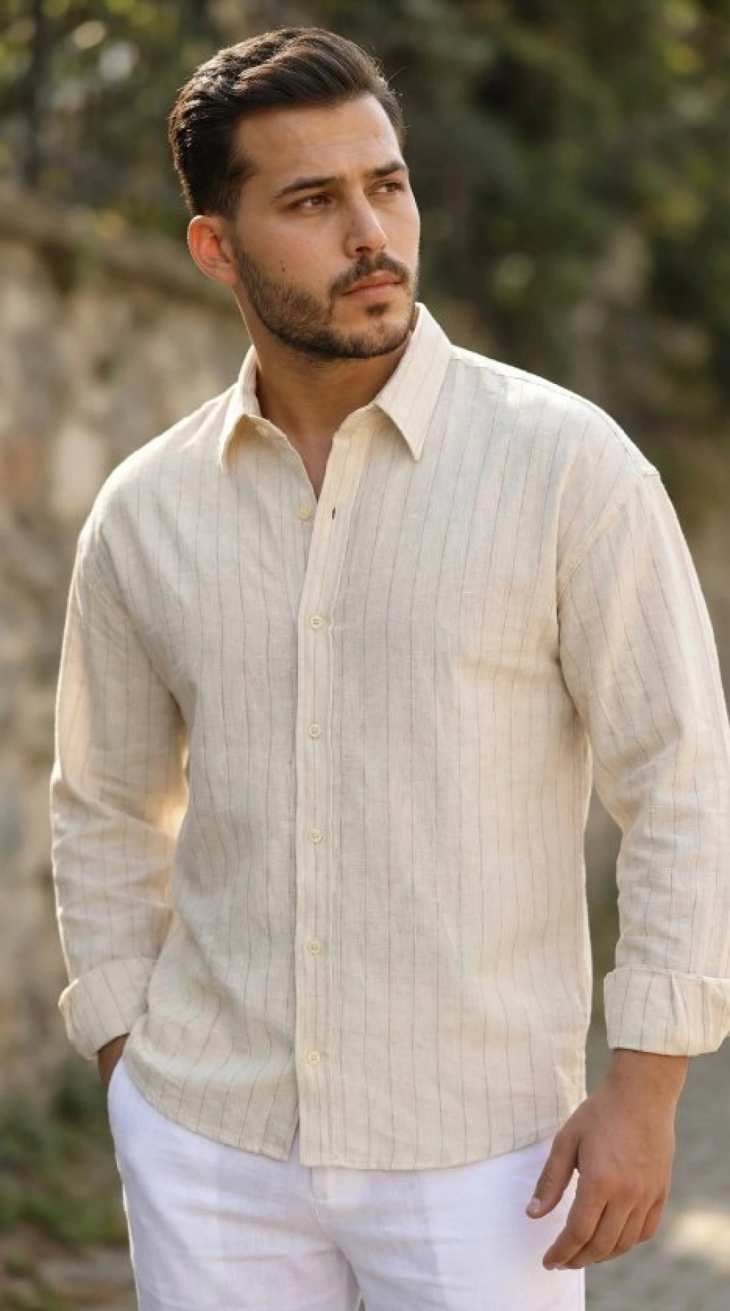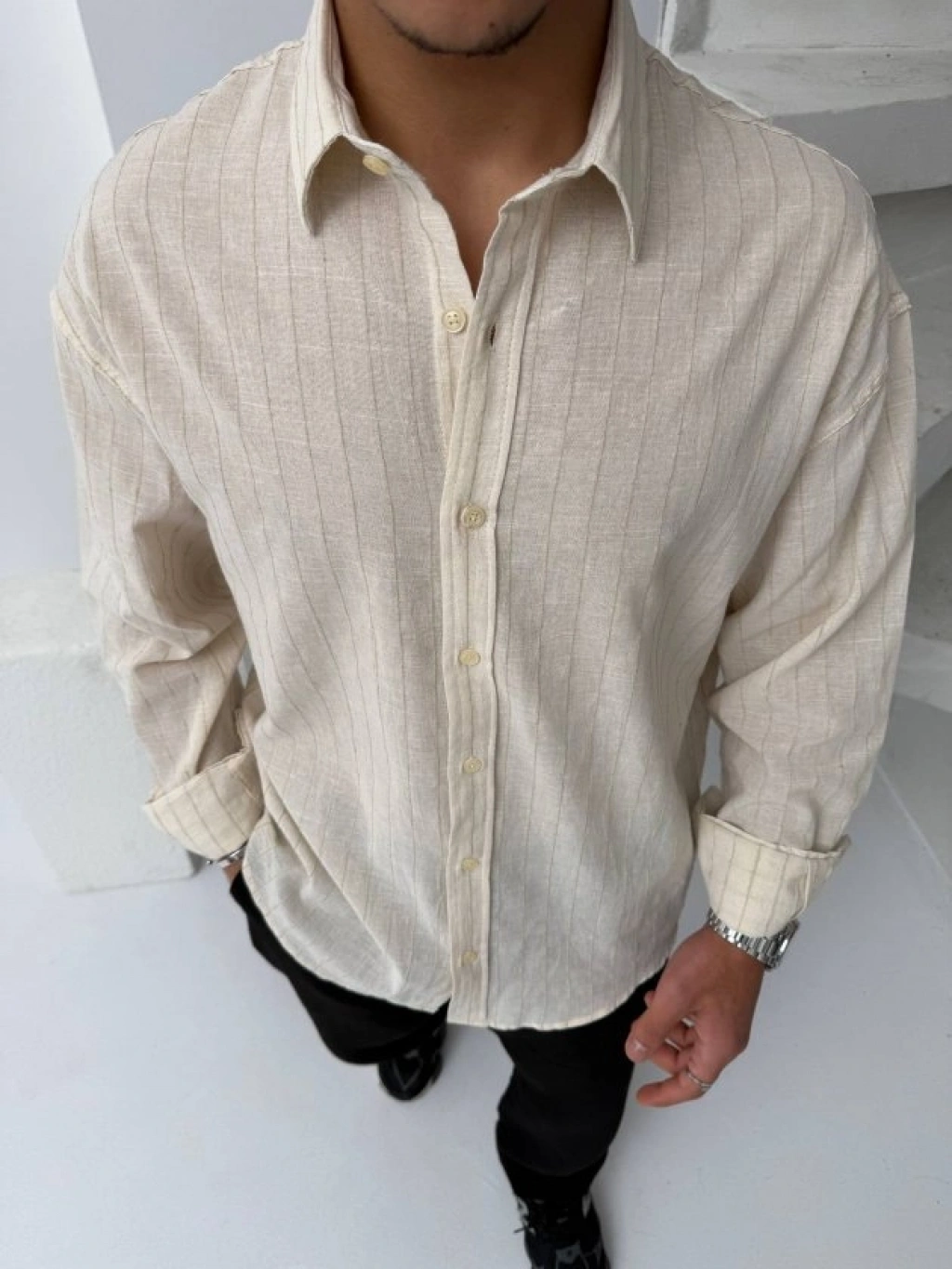 Erkek KETEN Kumaş Oversize Uzun Kollu Rahat Kalıp Gömlek Bej