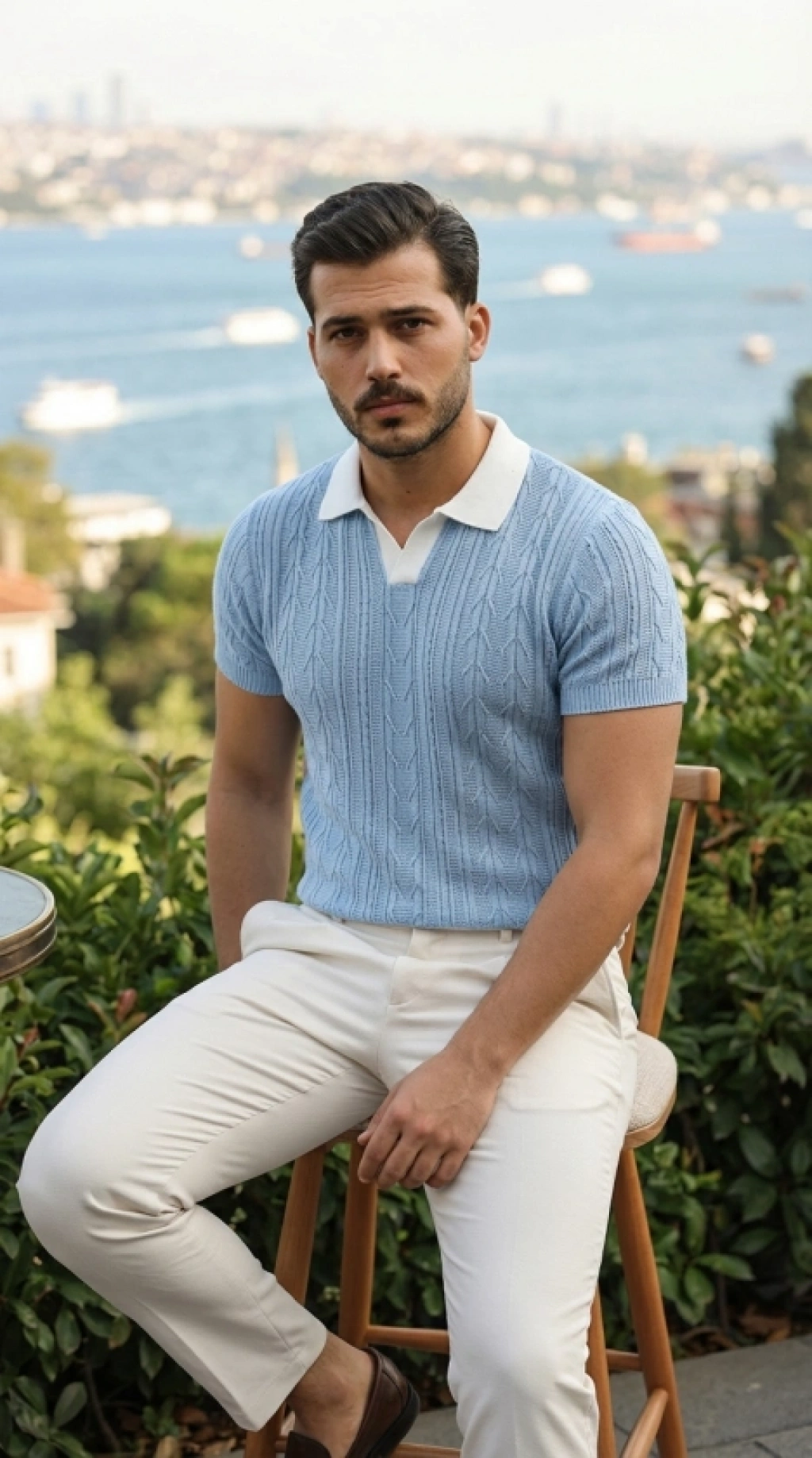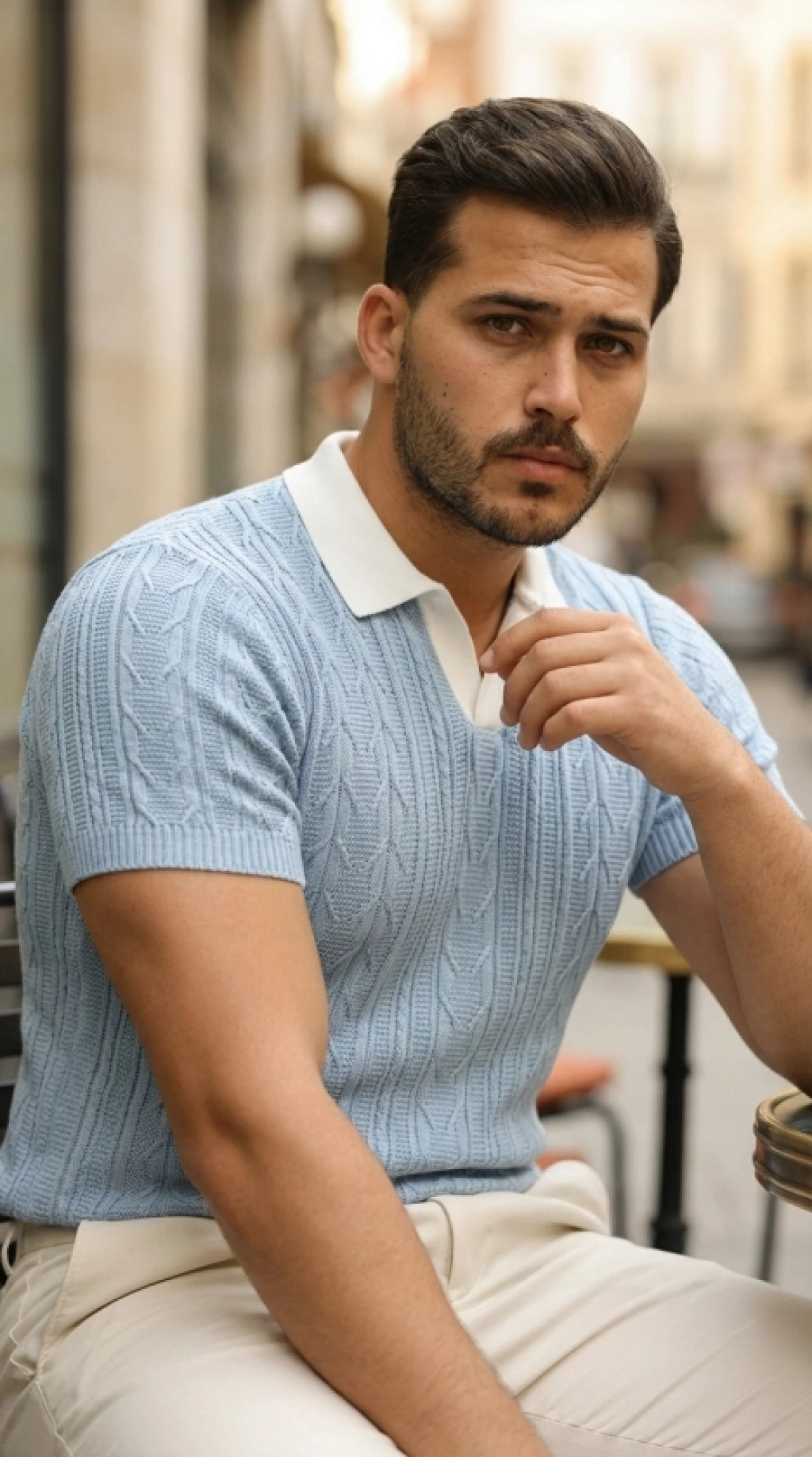 Erkek Kısa Kol Fitilli Triko Thirt Yazlık Hakim Yaka Tişört Bej