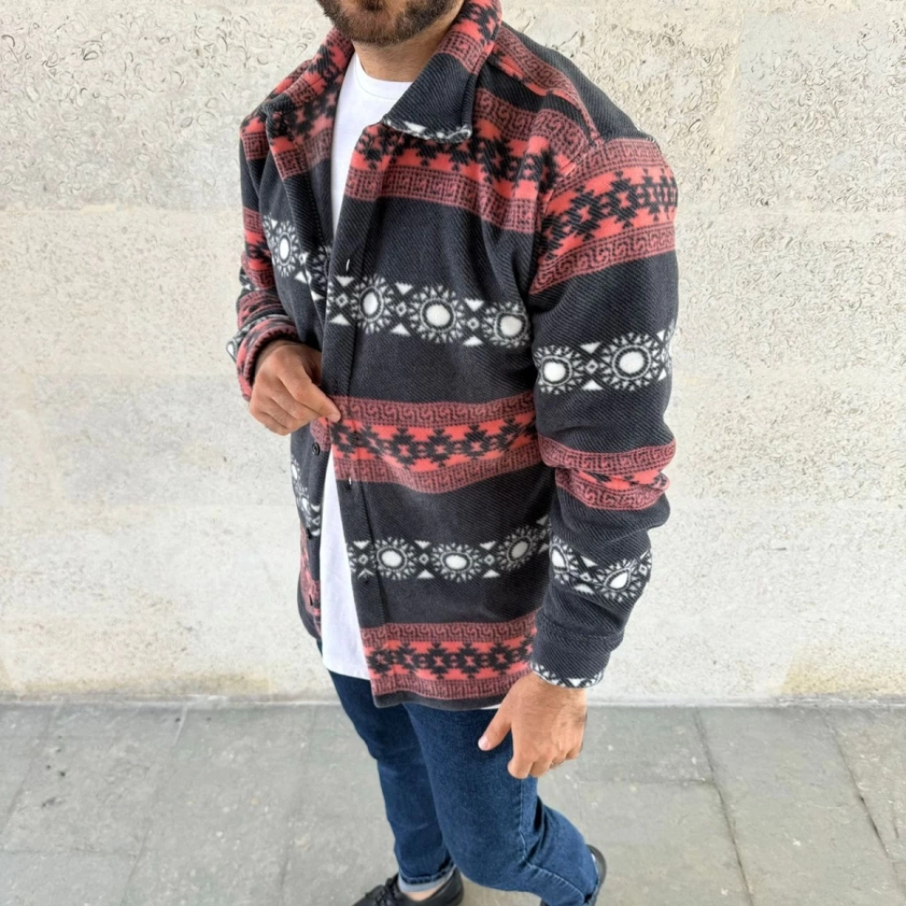 Erkek Desenli Polar Gömlek – Etnik Şerit Desen Yakalı, Uzun Kollu, Düğmeli, Oversize Rahat Kalıp Füme